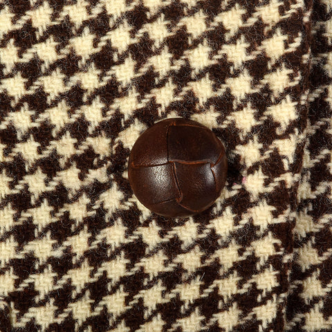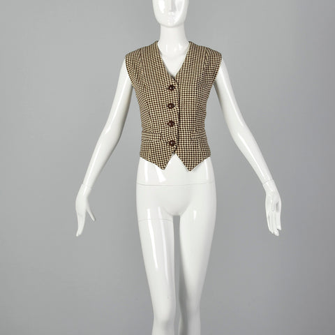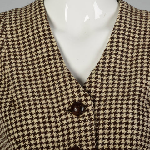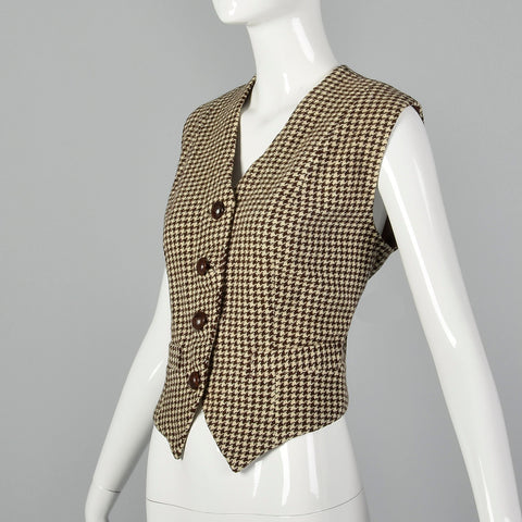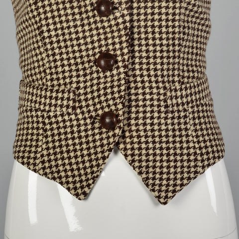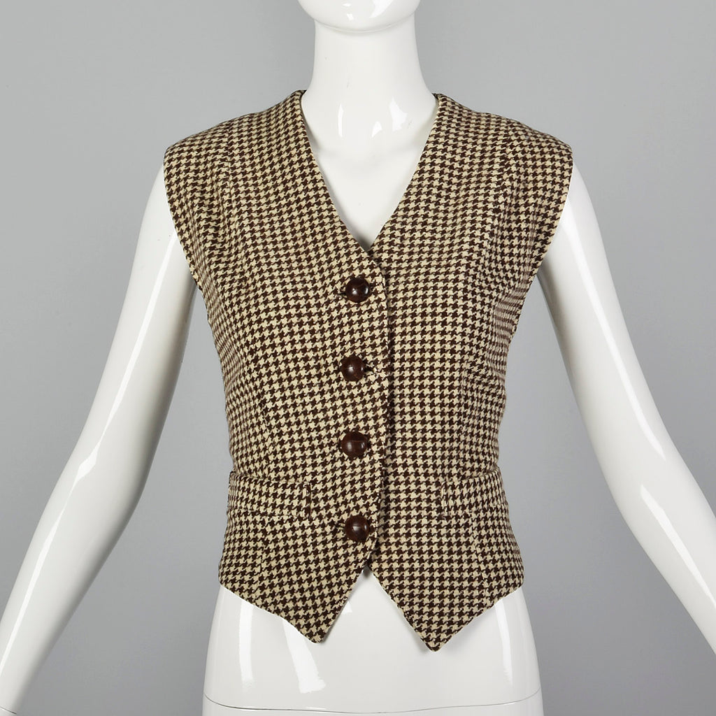 This listing is for one vest. Textile is unmarked. Houndstooth tweed vest. Brown and cream with brown buttons down the front. Front and back darts ...