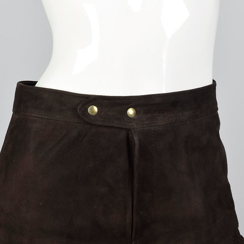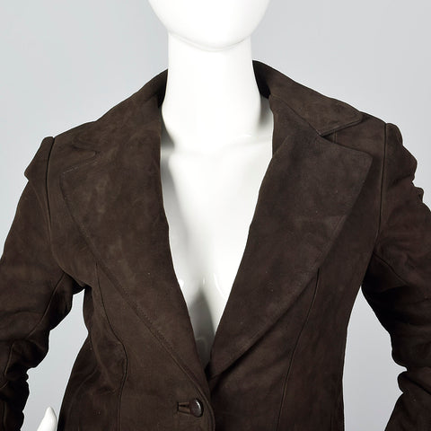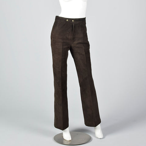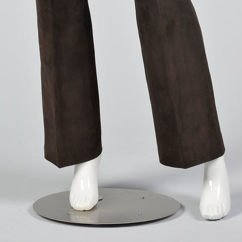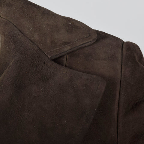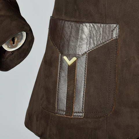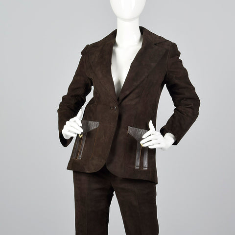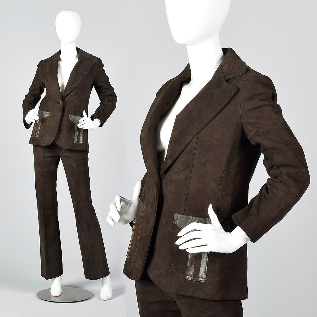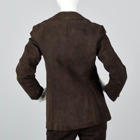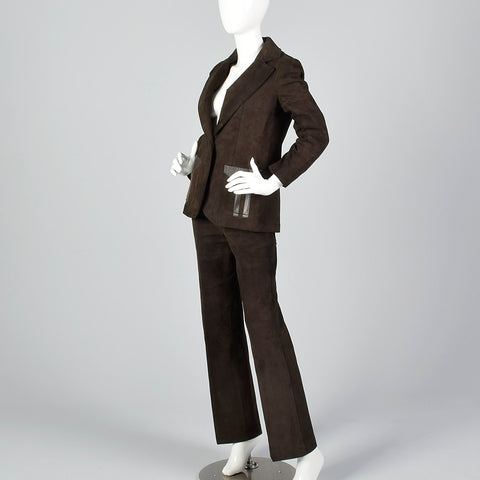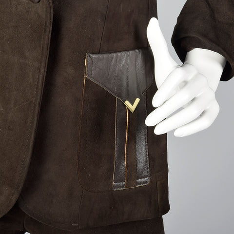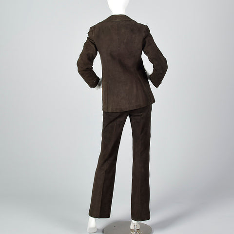 This suit includes one jacket and one pair of pants. The textile is brown suede leather. The jacket has wide lapels, long sleeves, and two patch po...