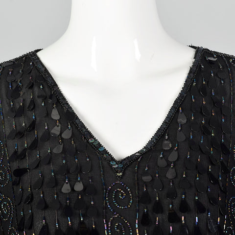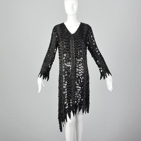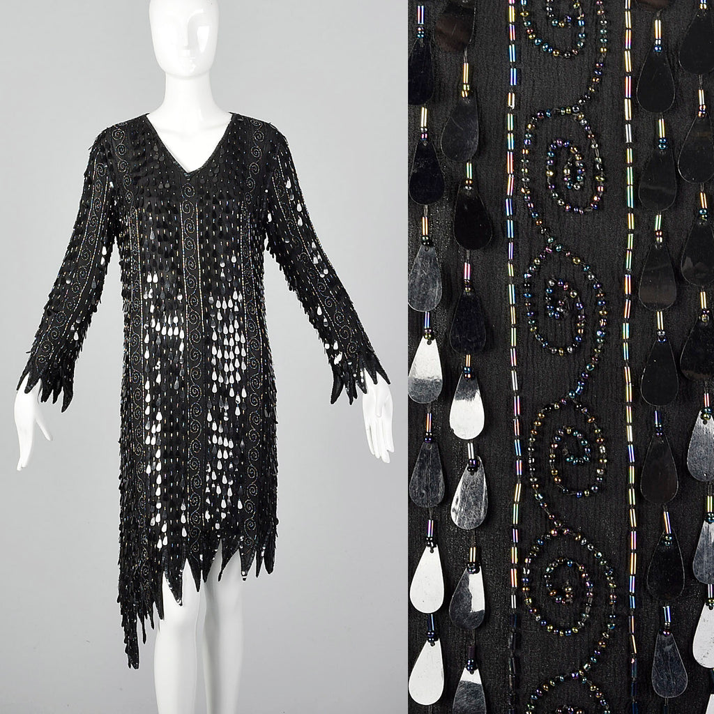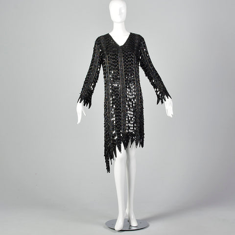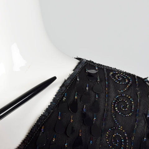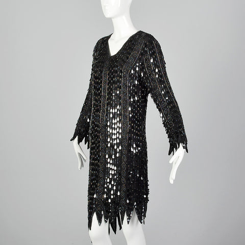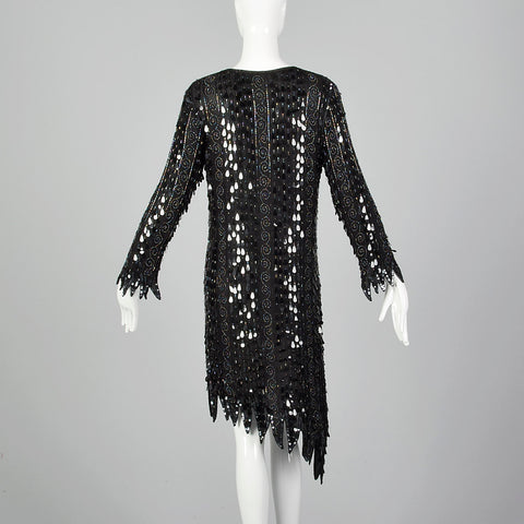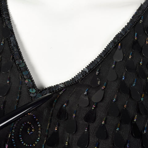 This listing is for one dress. Textile is silk. Frank Usher beaded silk dress. Black silk with large gangling teardrop paillettes. Flame edge at th...