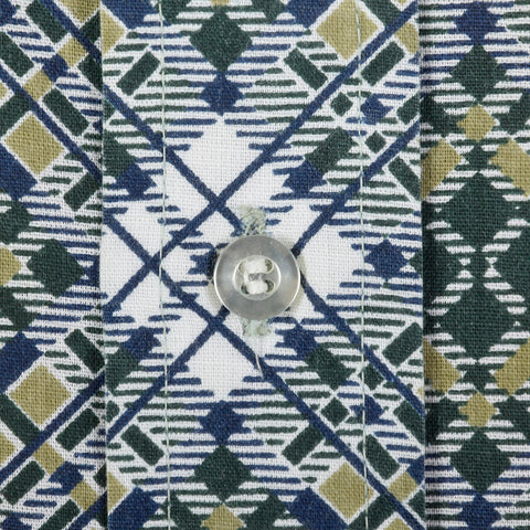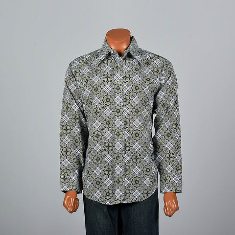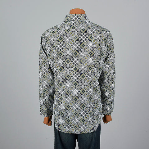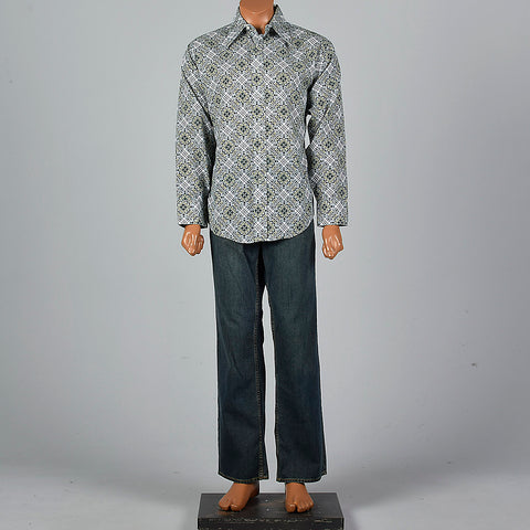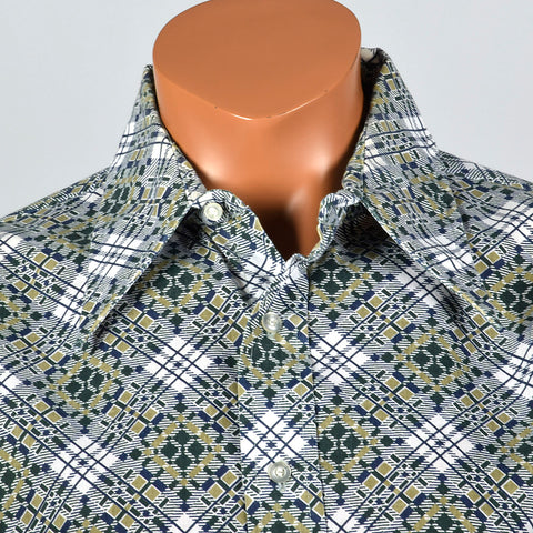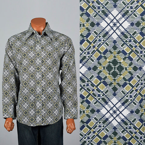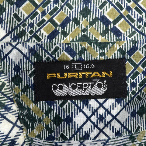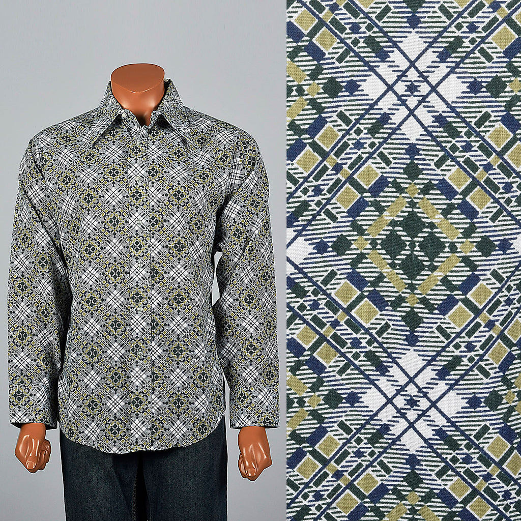This listing is for one shirt. Textile is unmarked. Print disco shirt. Green, white, and navy blue geometric print. Long sleeve, two buttons at eac...