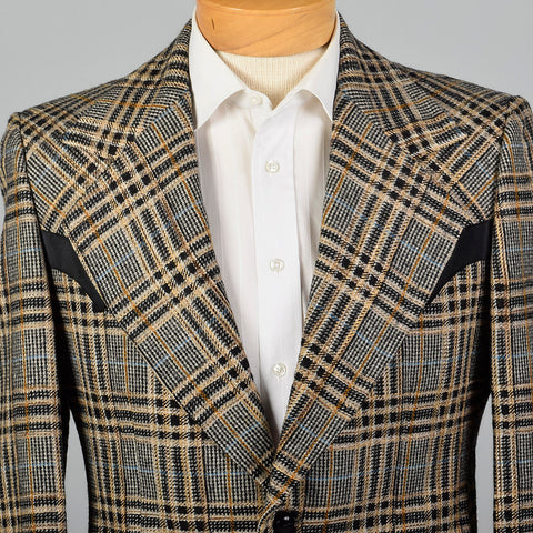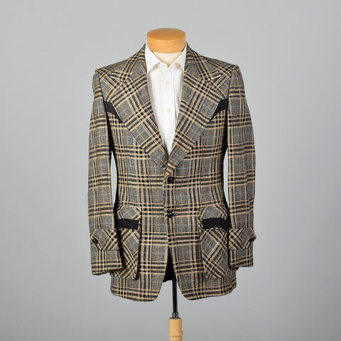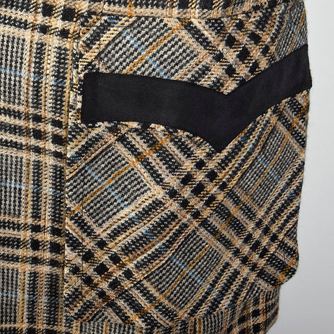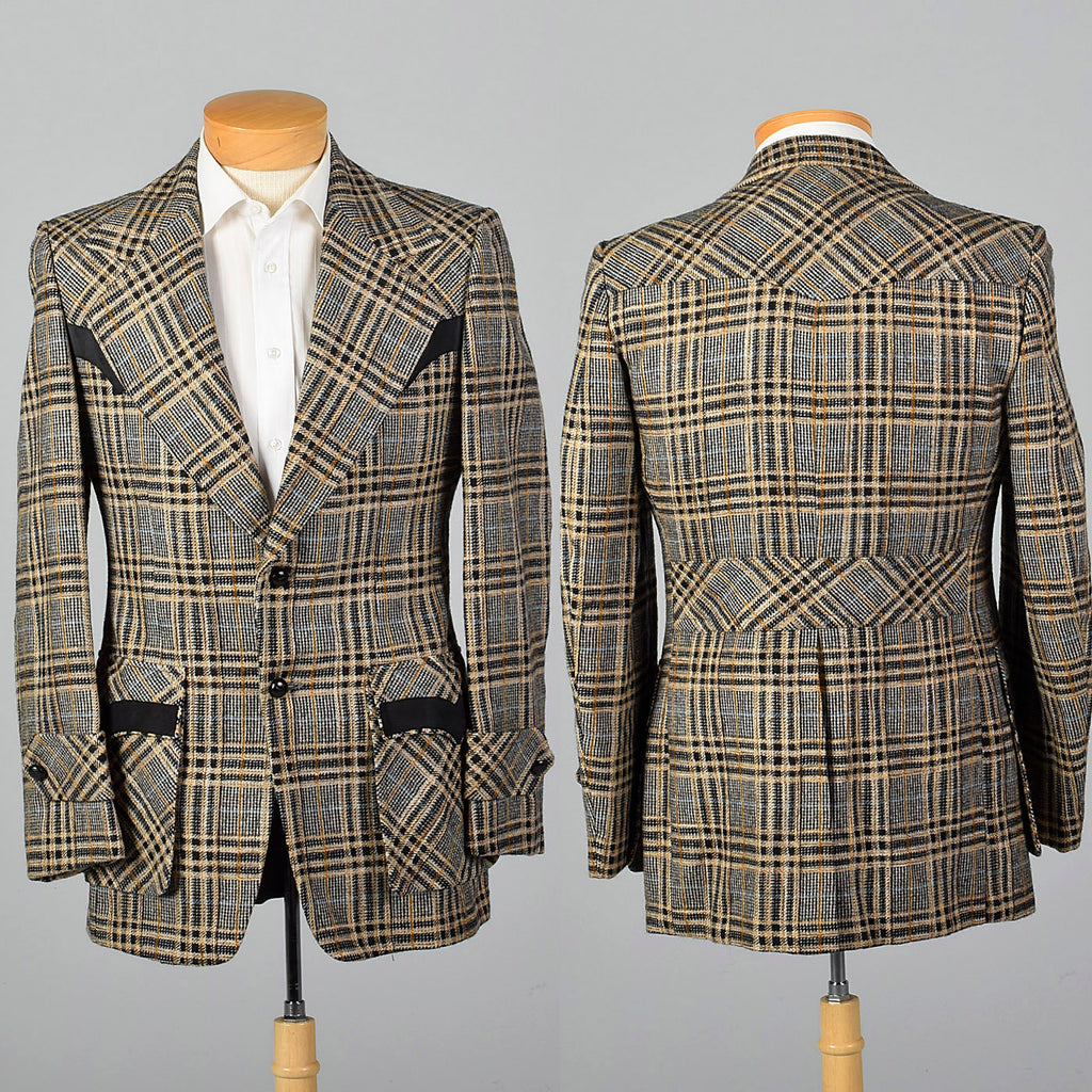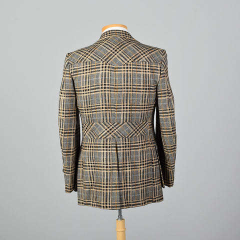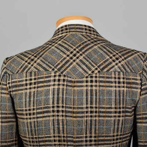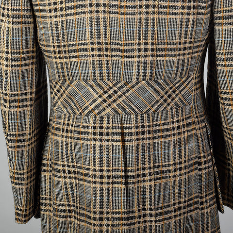 This listing is for one jacket. Textile is unmarked. Plaid tweed norfolk jacket. Tan, black, blue, and gray plaid. Two button front closure, two pa...