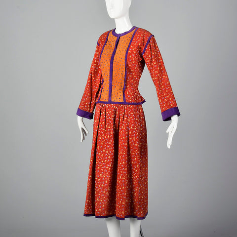 This is an incredibly unique 1970s suede set! This set includes one top and one skirt. The textile is unmarked, suede, in red, brown, and purple, a...
