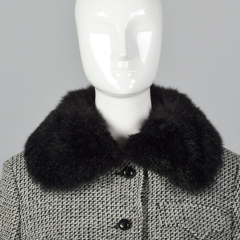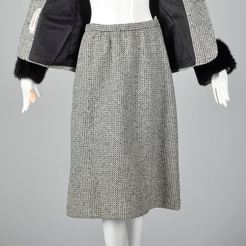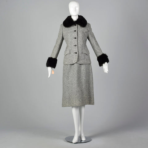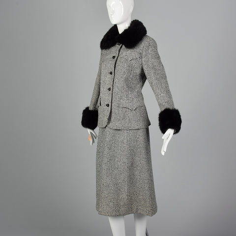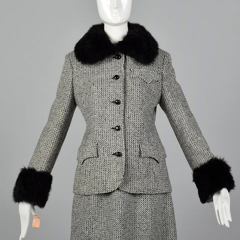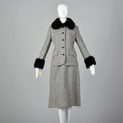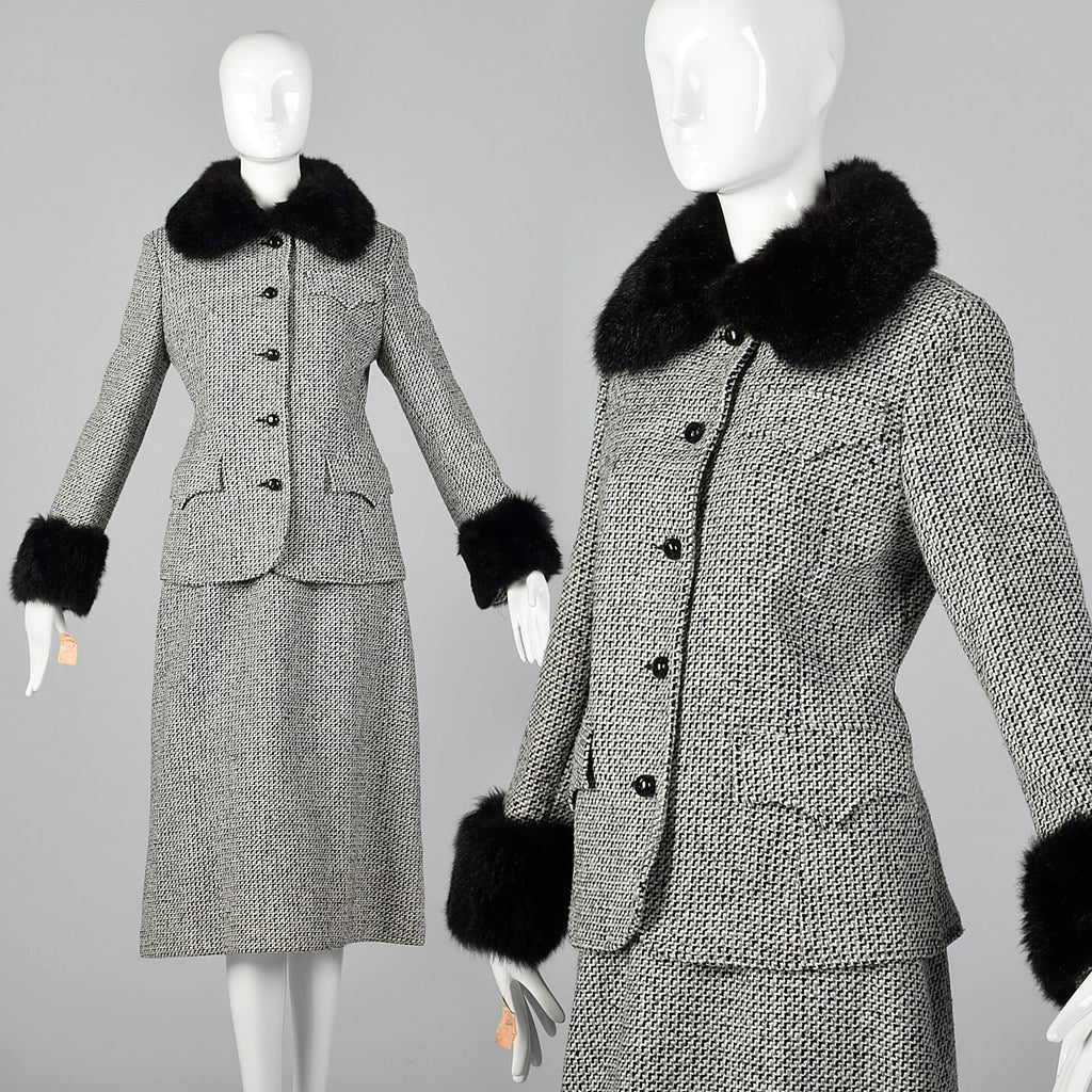This listing is for one skirt suit consisting of one top and one skirt. Textile is unmarked. Deadstock tweed skirt suit with fur trim. Textile is a...