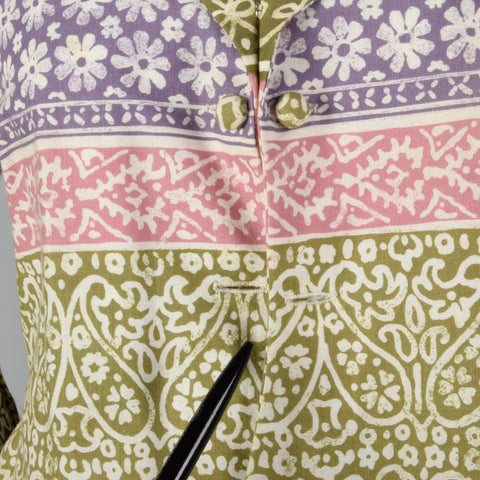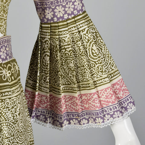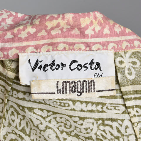 This 1970s Victor Costa set is perfect for summer! This set includes one top and one skirt. The textile is unmarked, in a green, pink, and purple p...