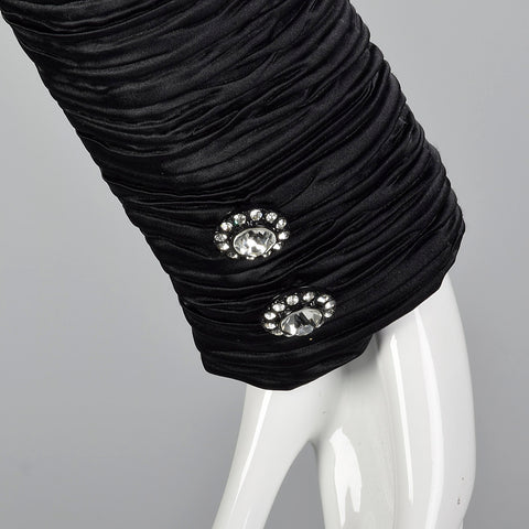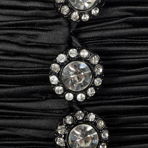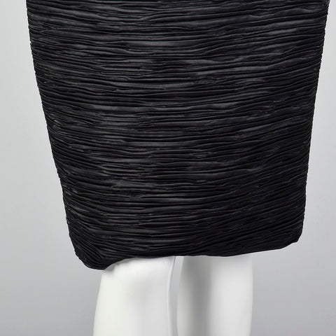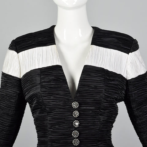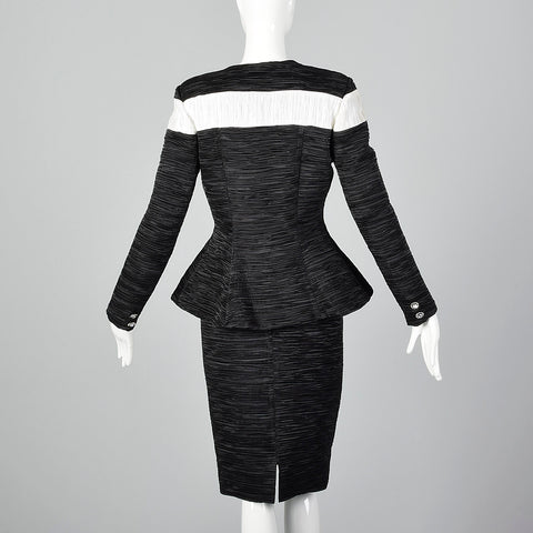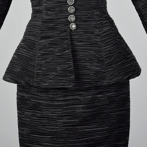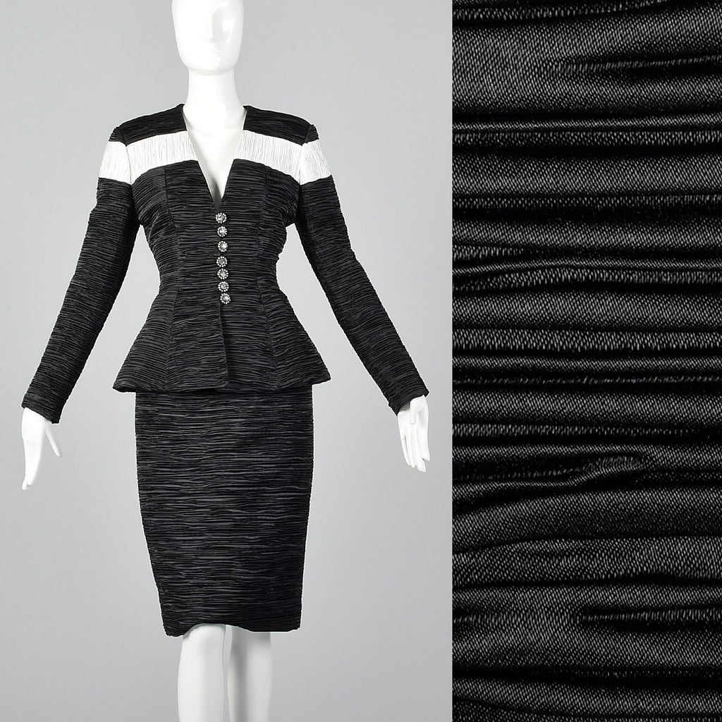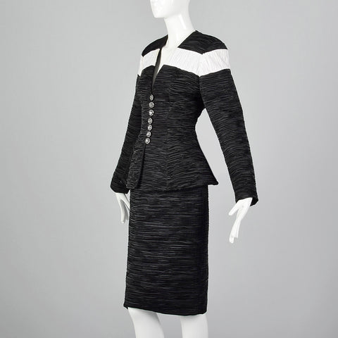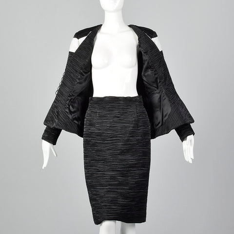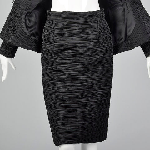 This suit includes one jacket and one skirt. The textile is 100% polyester in black and is done in Fortuny-style pleats. The jacket has long sleeve...