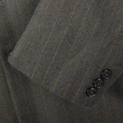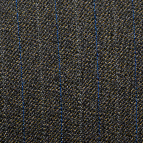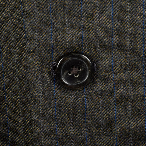 The textile of this men's suit jacket is unmarked, gray with royal blue stripes. This jacket is double breasted with a button front, medium width l...