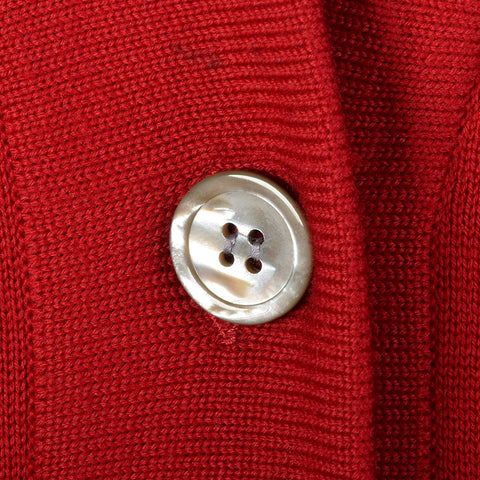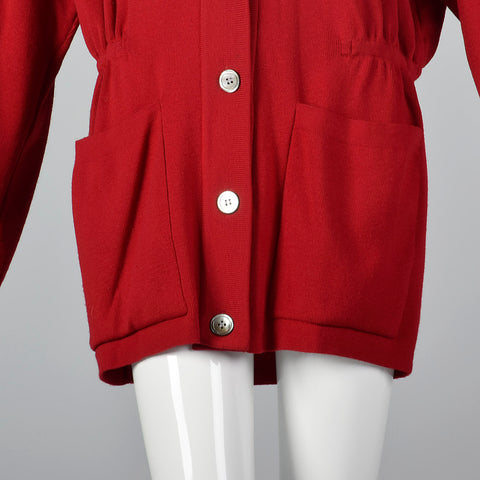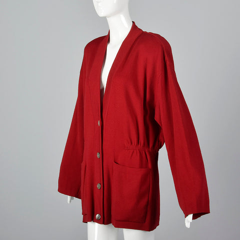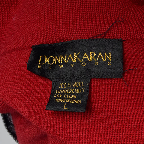 This vintage Donna Karen cardigan is a beautiful shade of deep red. The textile is 100% wool in a deep red, and this cardigan has a button front. T...
