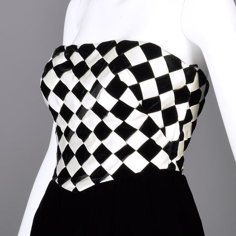 Details: This is a two piece set including 1 dress and 1 jacket. The dress is sleeveless with a black velvet skirt. The bodice is woven into a chec...