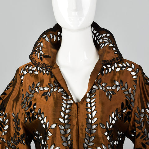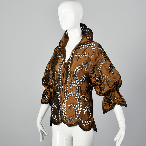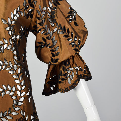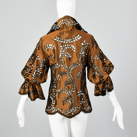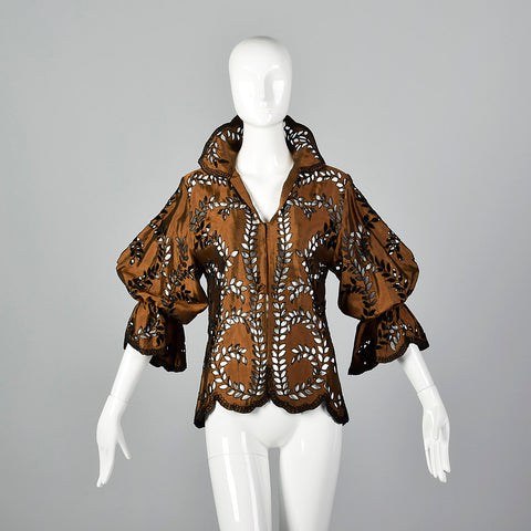 This listing is for one blouse. Textile is unmarked. Victor Costa bronze metallic blouse. Fan collar, bishop style sleeve with scalloped ruffle. Sc...
