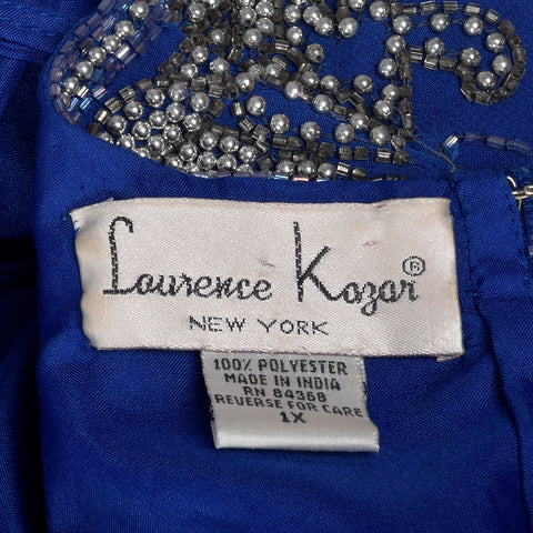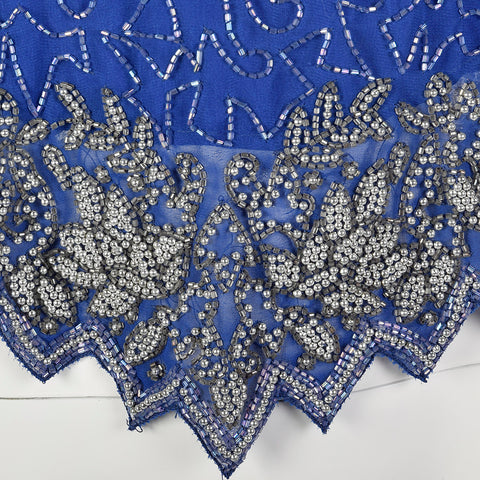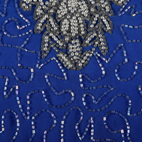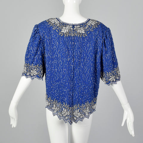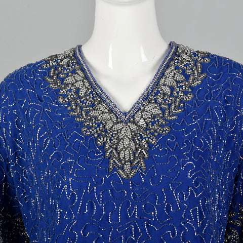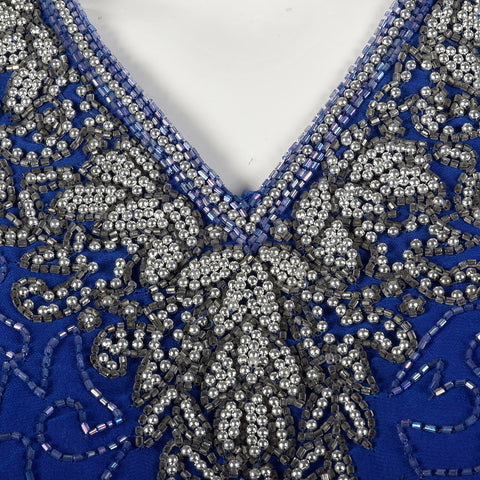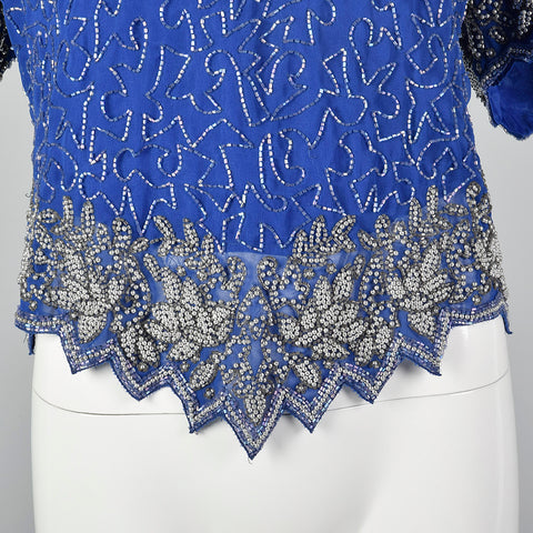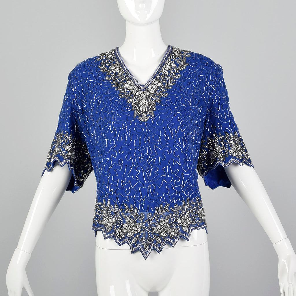 This listing is for one shirt. Textile is polyester. Beaded blouse. Blue with silver beading at the neckline, cuffs, and hem. Iridescent beads thro...