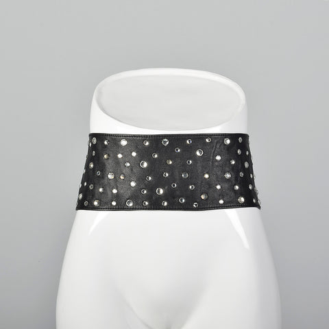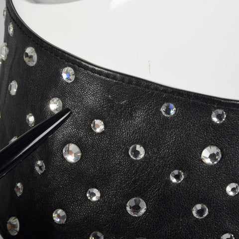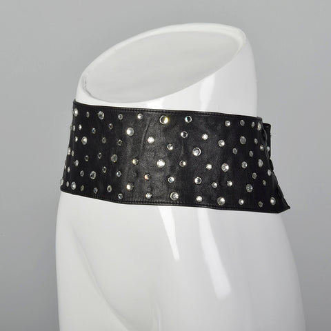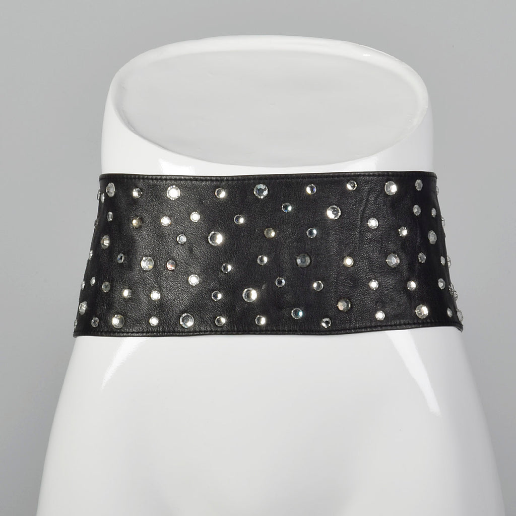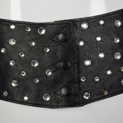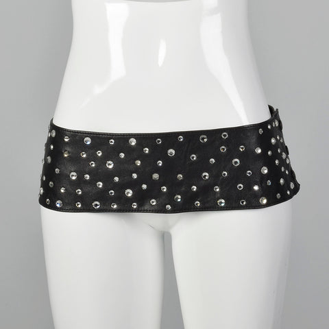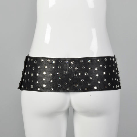 This listing is for one belt. Textile is unmarked, leather. Leather belt with rhinestones. This belt is made to be worn on the hips. Clear rhinesto...