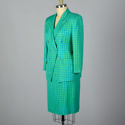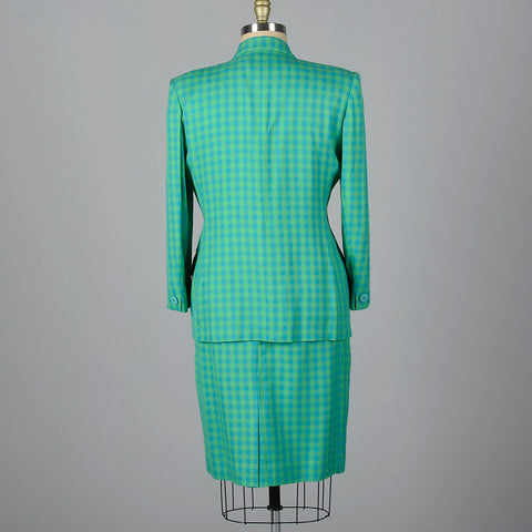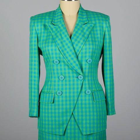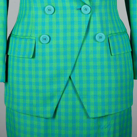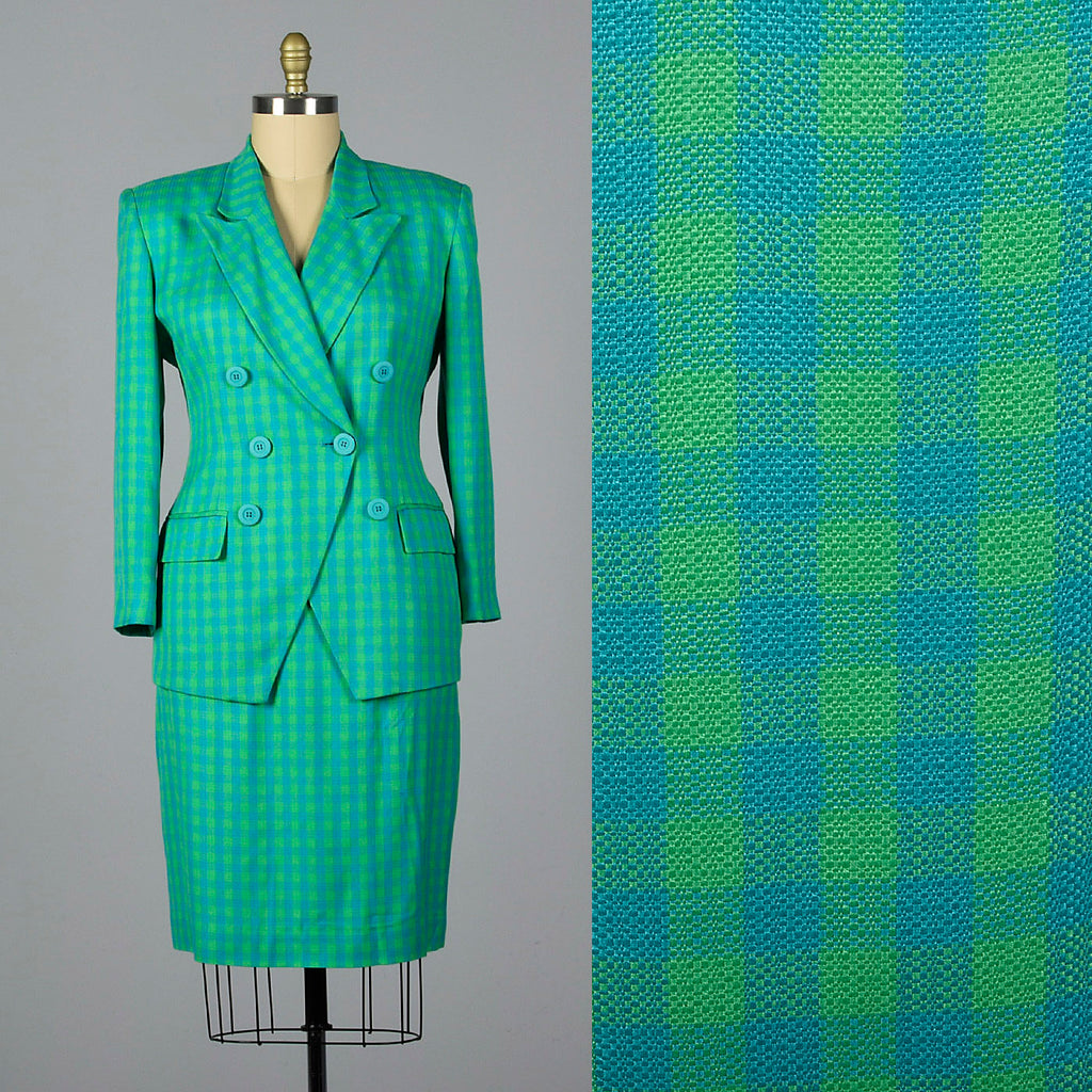This suit includes one jacket and one skirt. The textile is 100% rayon in green and blue gingham check. The jacket has long sleeves, wide lapels, d...