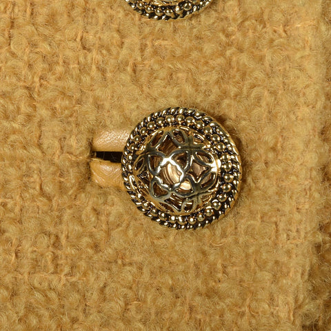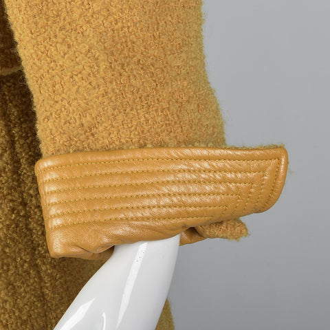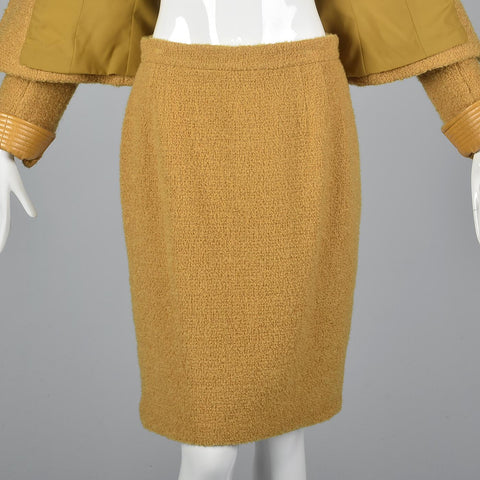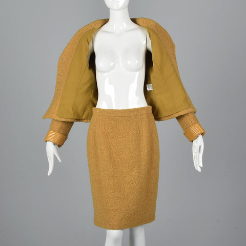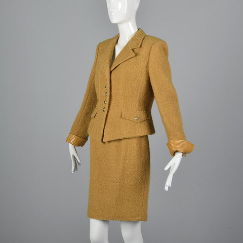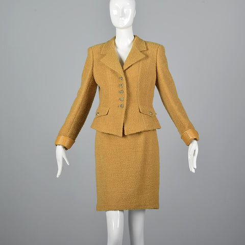 Soft and nubby mustard yellow boucle wool suit with leather trim. Jacket is slightly fitted at the waist with tons of great details. Leather trim o...