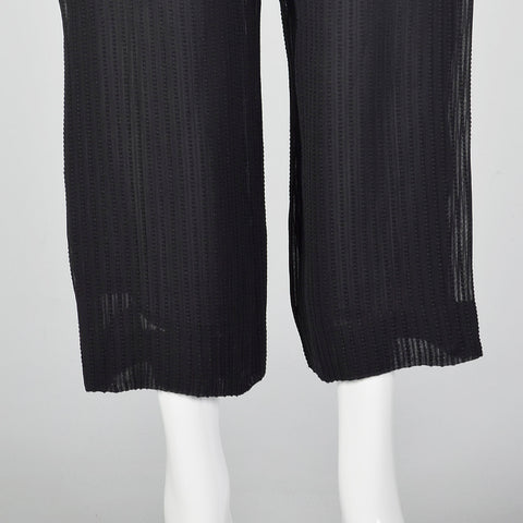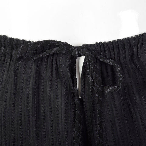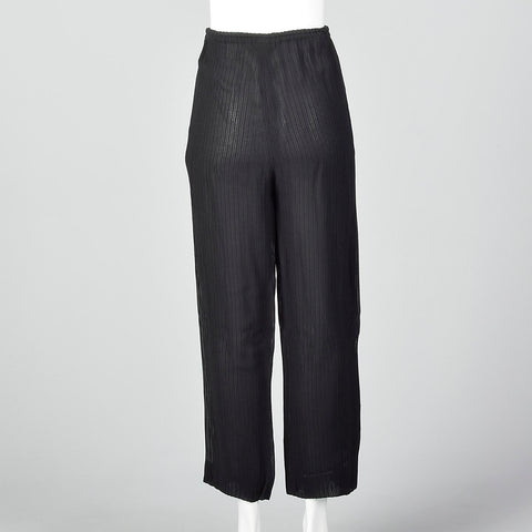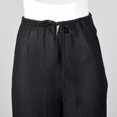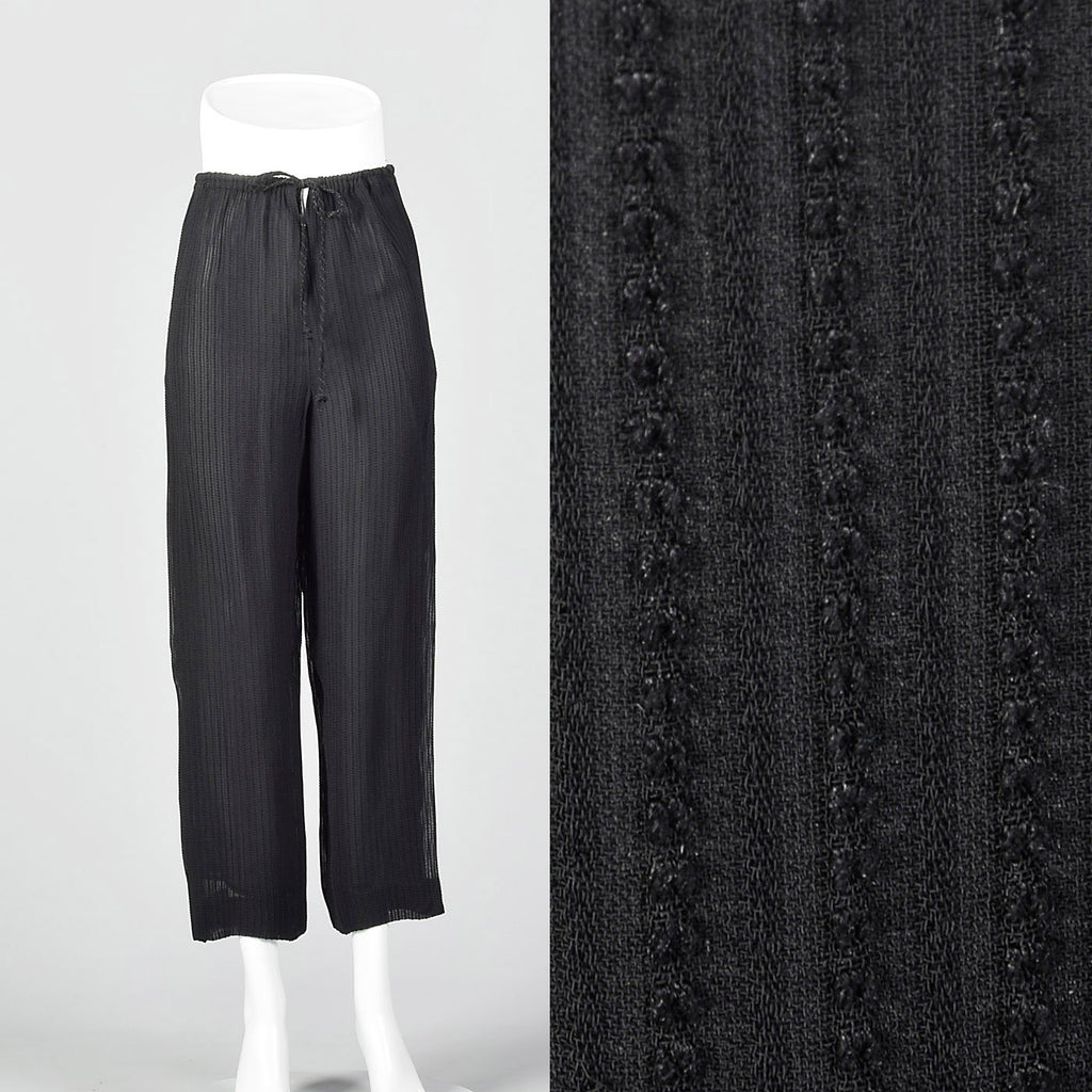 The textile of these pants is unmarked, black silk, and is lightweight. These pants have an elastic waist with a drawstring tie and a loose fit. Th...
