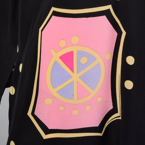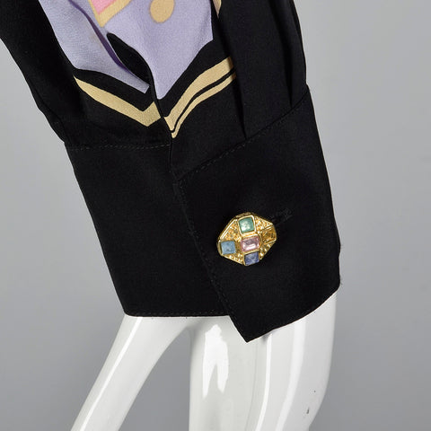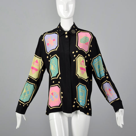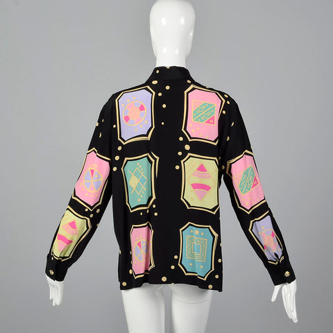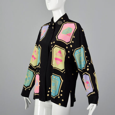 This listing is for one blouse. Textile is unmarked. Geometric print black blouse. Textile is lightweight, slightly sheer with a silky feel. Button...