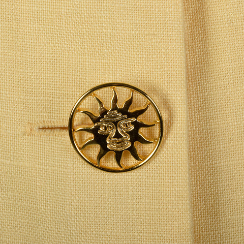 This suit includes one jacket and one skirt. The textile is 100% linen in yellow and is lightweight. The jacket has long sleeves, shoulder pads, go...