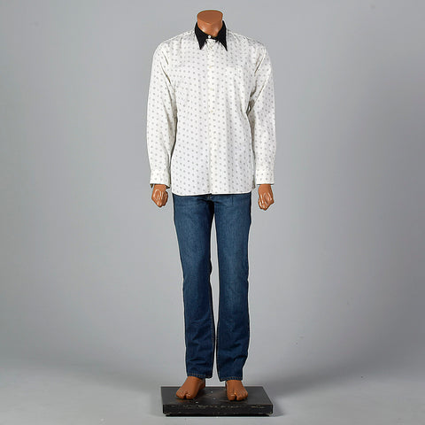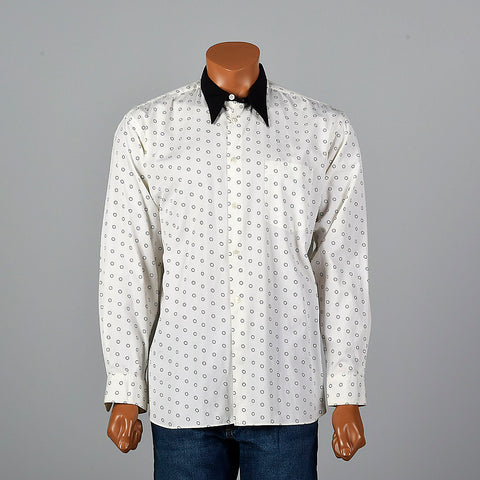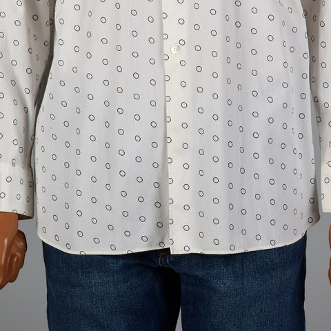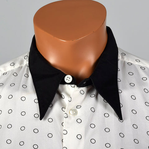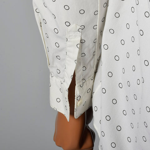 This listing is for one shirt. Textile is cotton. Circle print shirt. This is a white shirt with black circles and collar. Fabric has a slight, lin...