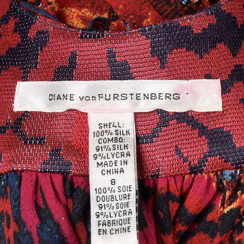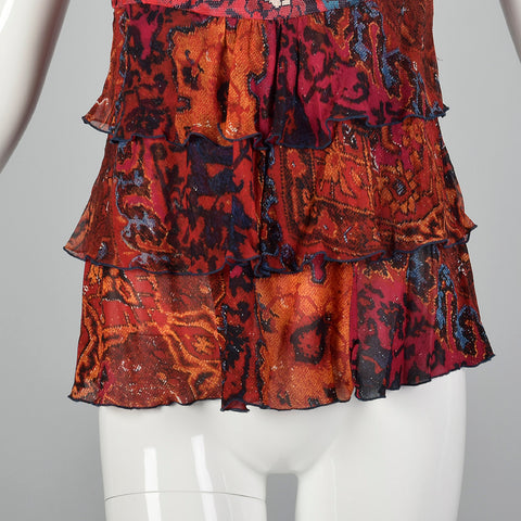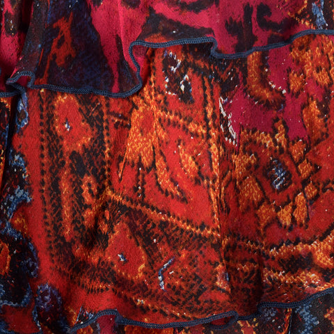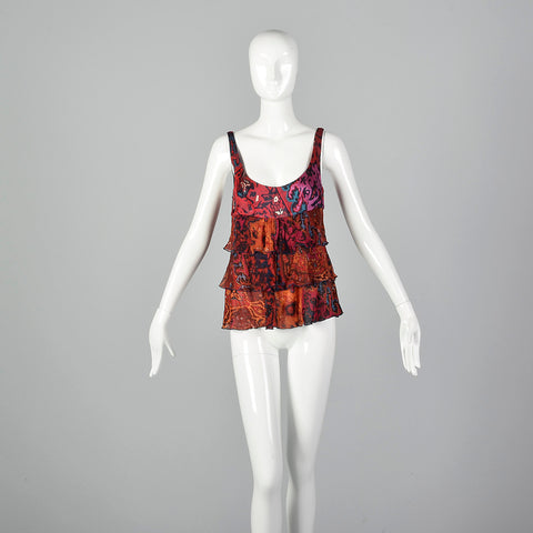This listing is for one shirt. Textile is silk. Silk swing top. Abstract red, blue, yellow, pink print. Empire waist with three rows of ruffles tha...