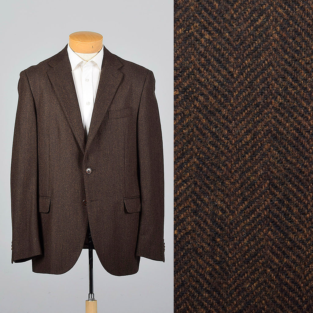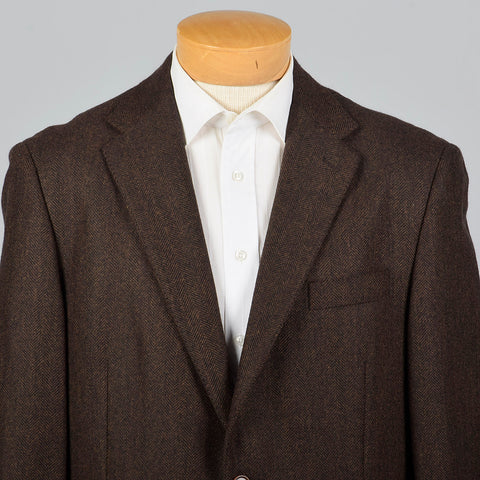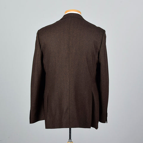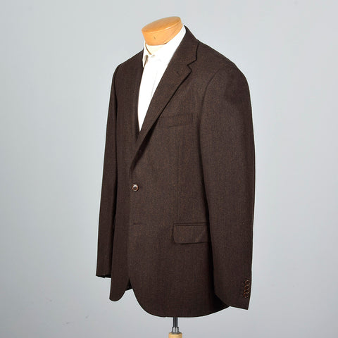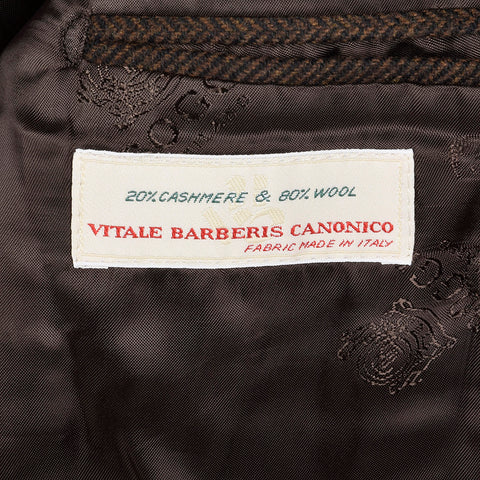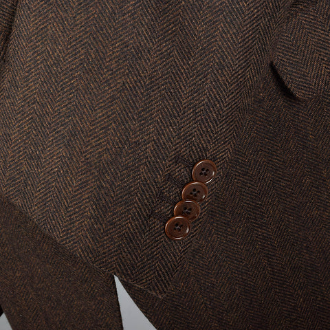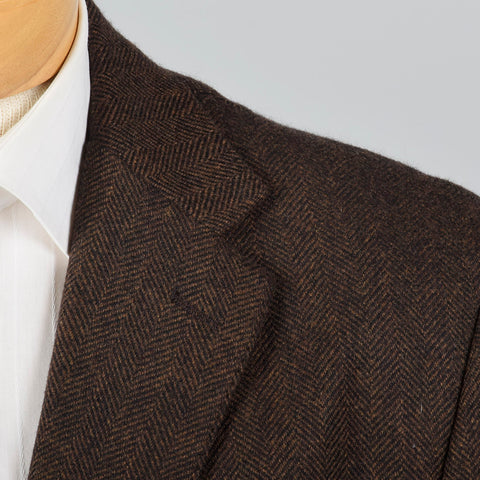 The textile of this men's jacket is 80% wool, 20% cashmere in brown. This jacket has a three button front, medium width lapels, convertible flap po...