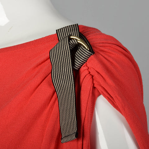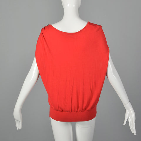 This listing is for one shirt. Textile is a rayon blend. Knit asymmetrical top. Sleeveless knit top with drop shoulders. Red with a tan and black d...