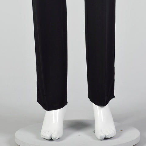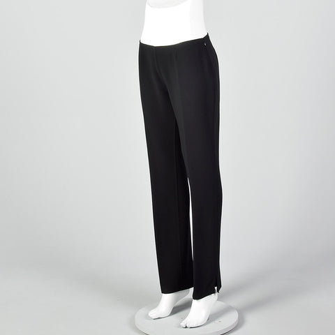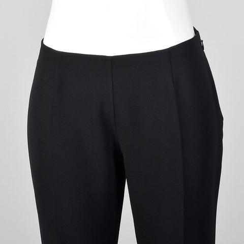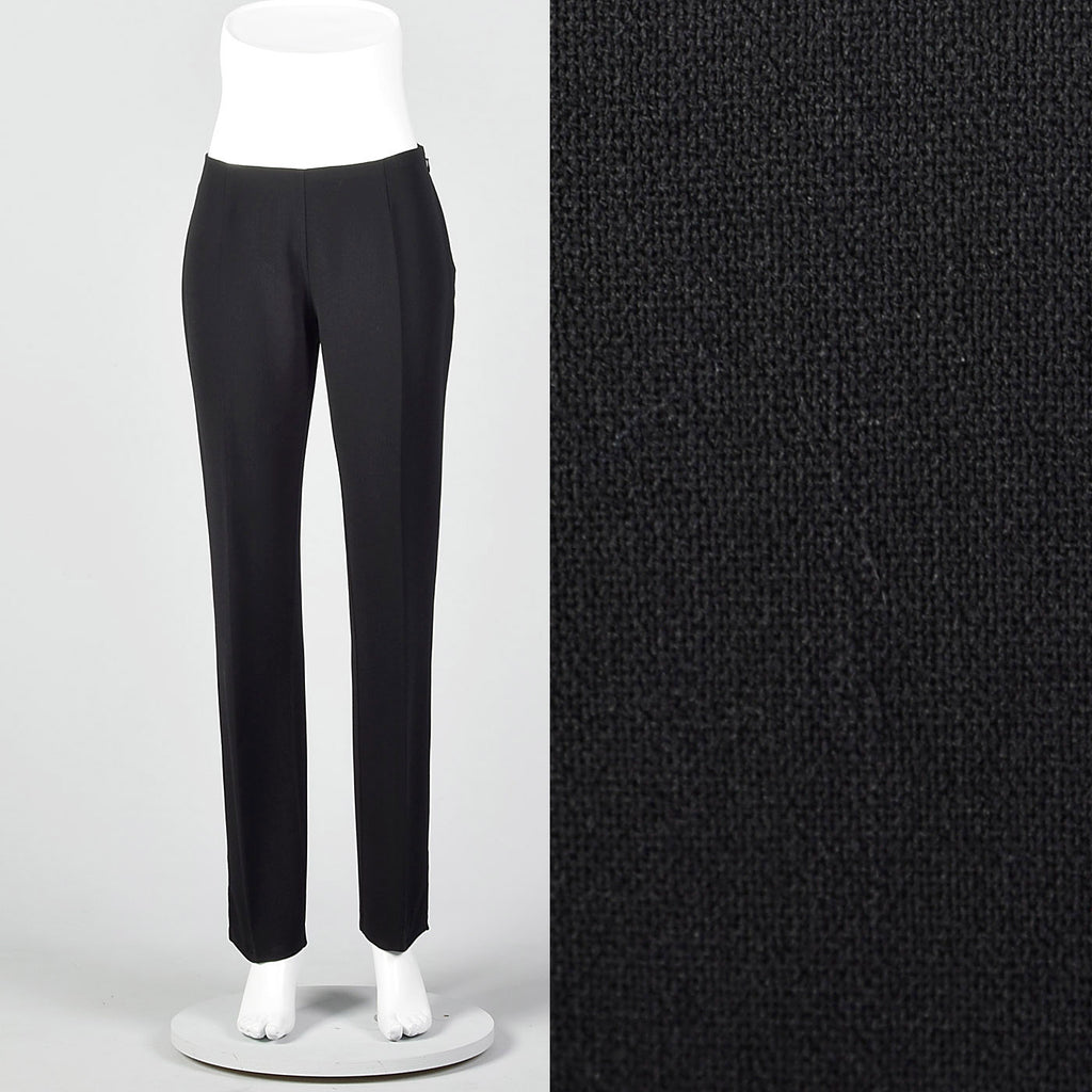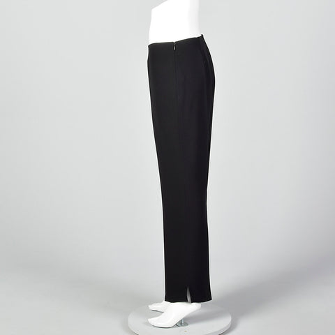The textile of these pants is a wool blend in black and has stretch, but there is no stretch in the waist. These pants have a pleated leg with slit...