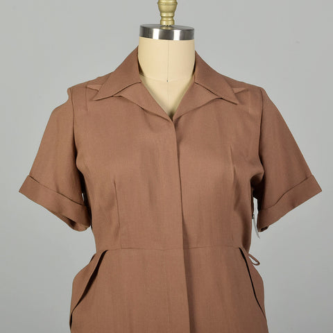3XL 1950s Brown Day Dress Zip Front Short Sleeve Casual Volup