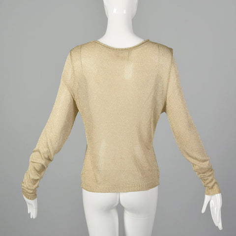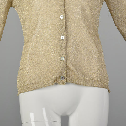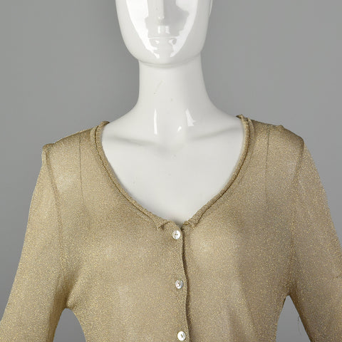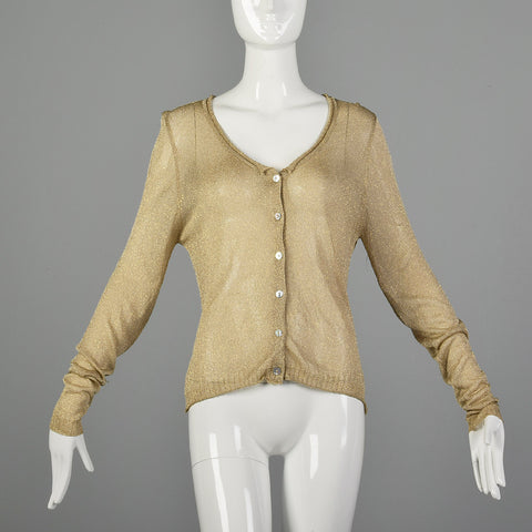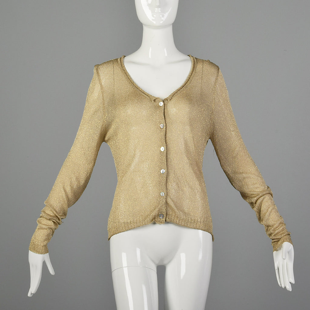 This listing is for one cardigan sweater. Textile is a rayon blend. This slinky lightweight gold cardigan is ready to dress up or down. Sheer with ...