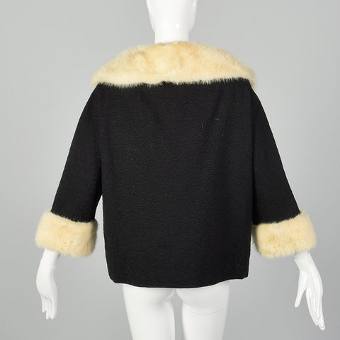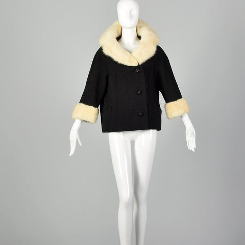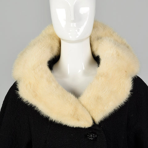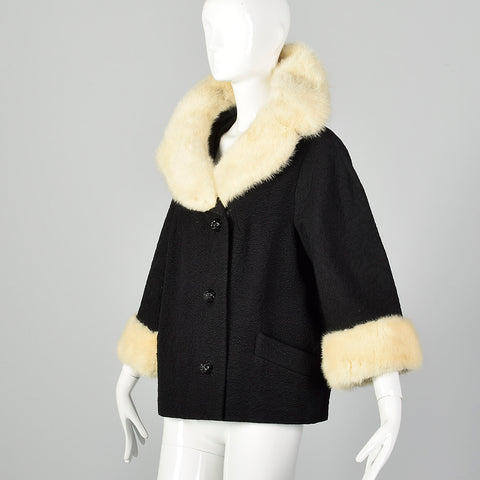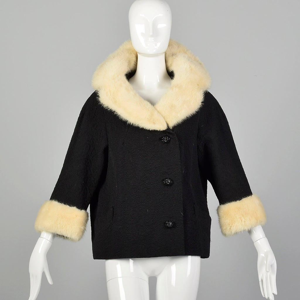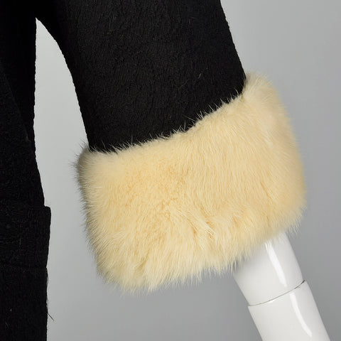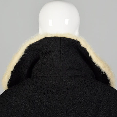 This listing is for one coat. The textile is unmarked wool and fur. Winter weight black coat with a textured paisley pattern. Asymmetric closure wi...