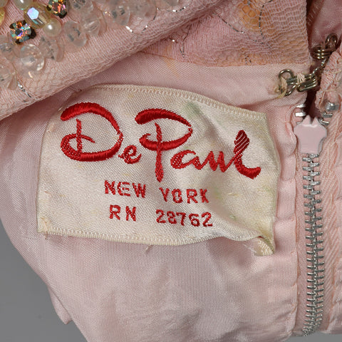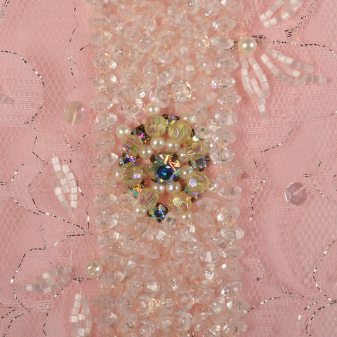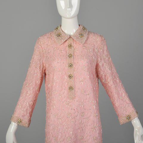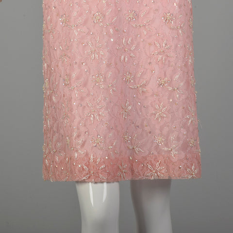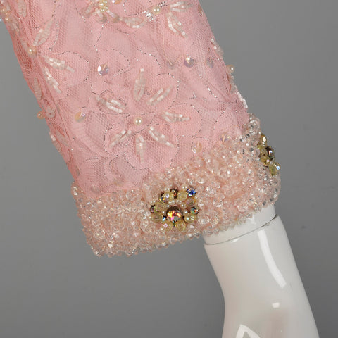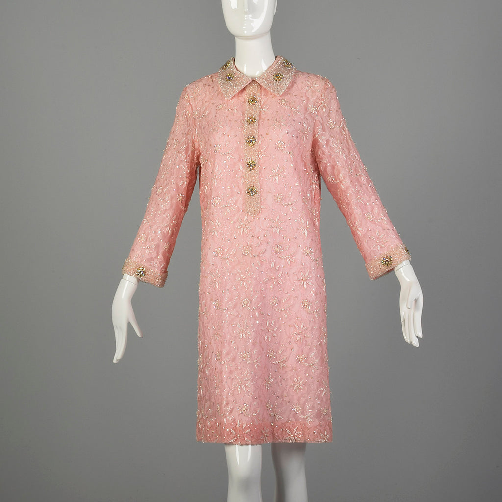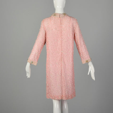 Large 1960s Mod Pink Dress Beaded Lace Long Sleeve Cocktail Party