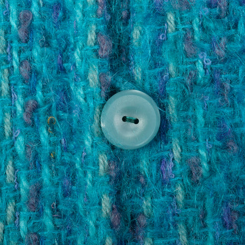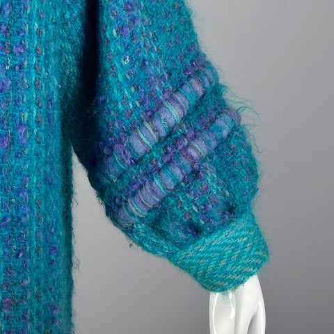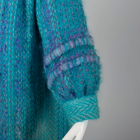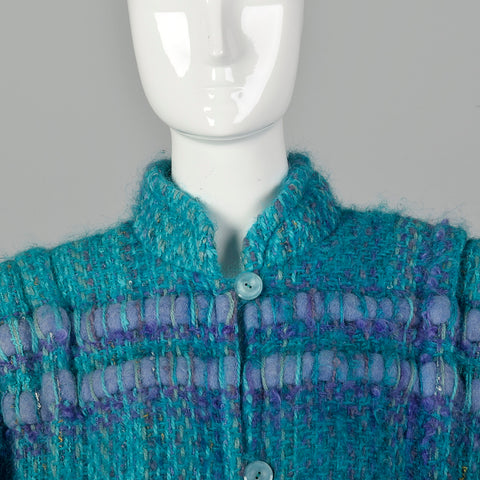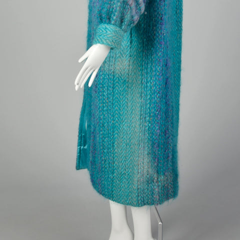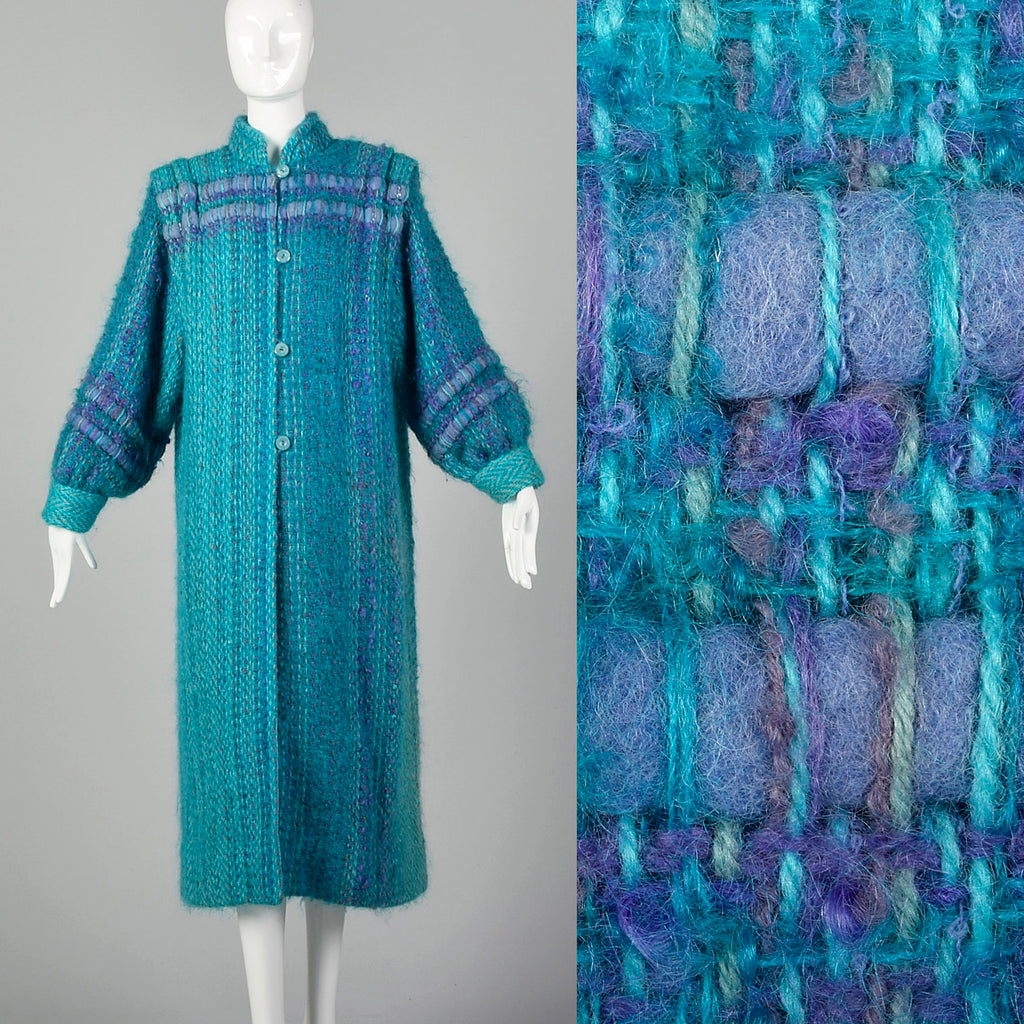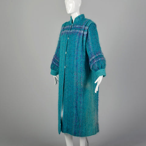 This listing is for one coat. The textile is unmarked but feels like mohair. Blast off in this futuristic teal cardigan coat. Material has differen...