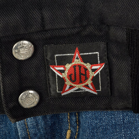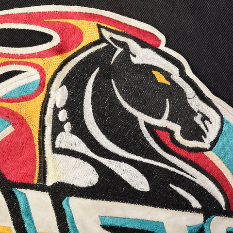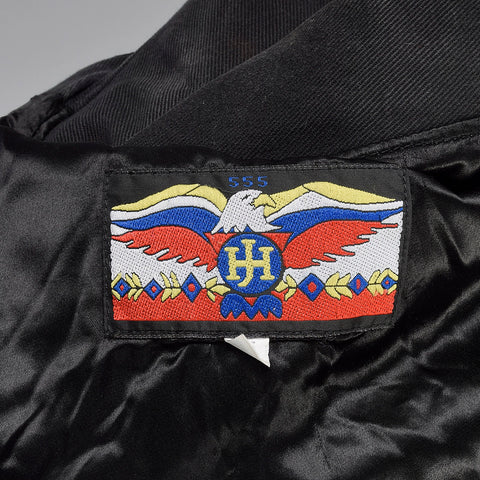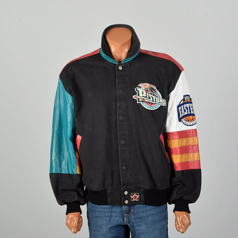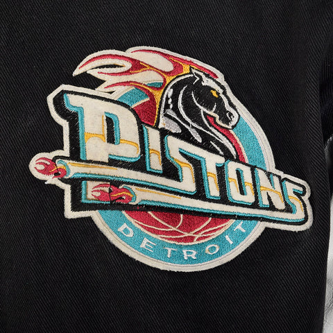 Large Jeff Hamilton 1990s Black Denim and Leather Detroit Pistons Jacket