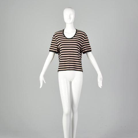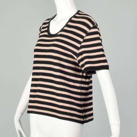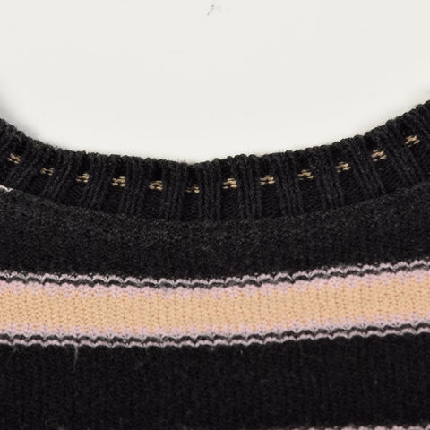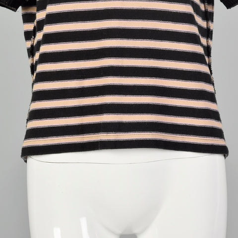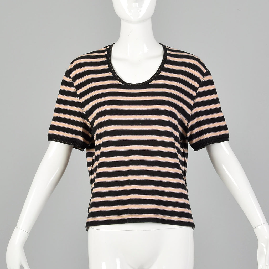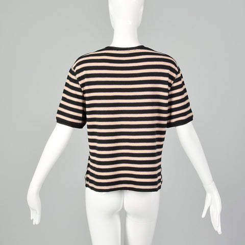 This listing is for one sweater. The textile is unmarked. Lightweight, spring, short sleeve sweater. Pattern of pink, black, and apricot stripes. R...