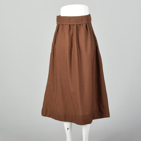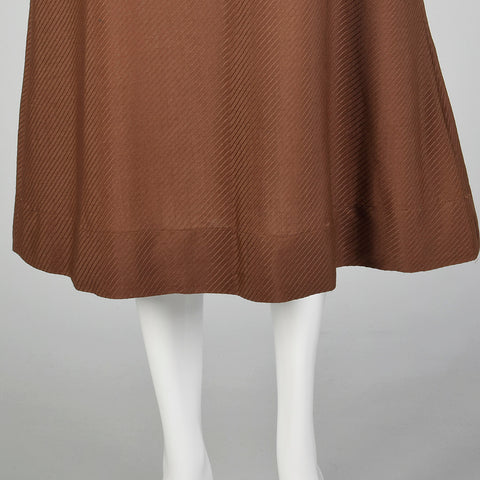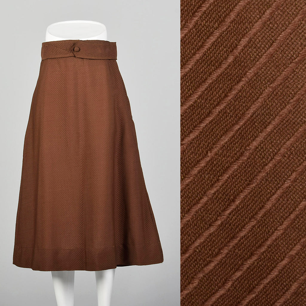 This listing is for one skirt. The textile is unmarked but feels like a lightweight wool.. Brown skirt with a textured diagonal stripe. Attached be...