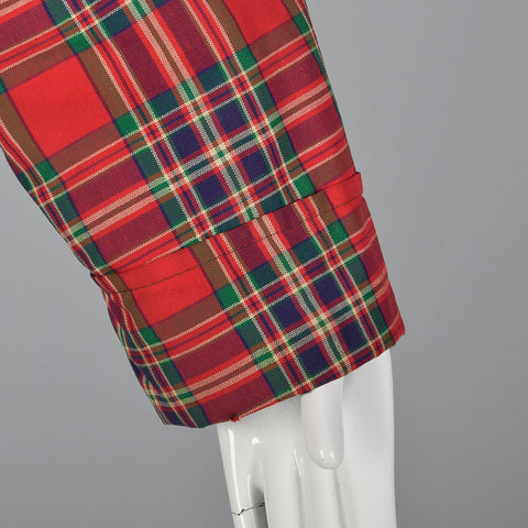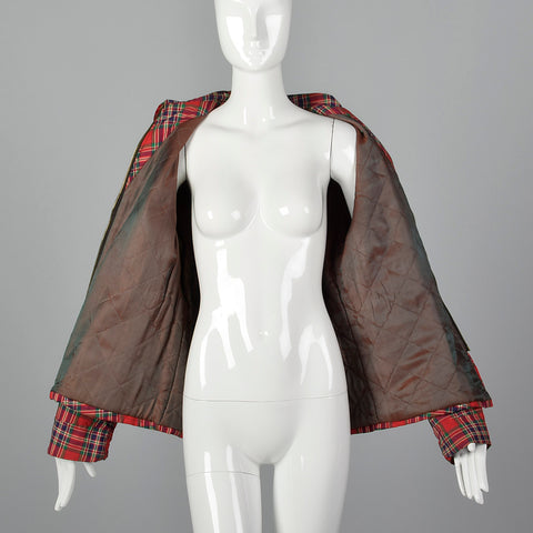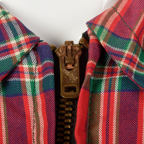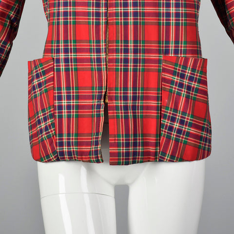 This listing is for one jacket. The textile is unmarked. Fabulous red tartan, plaid jacket. The garment features a fitted elastic waist and two fro...