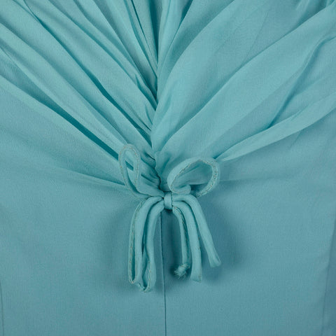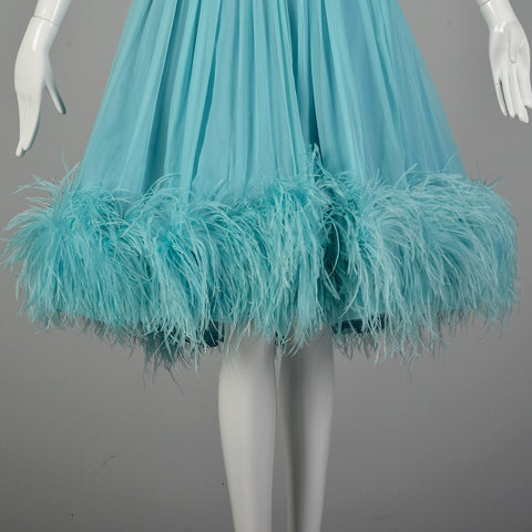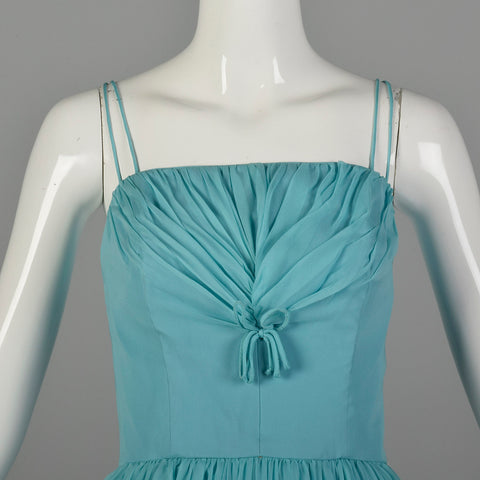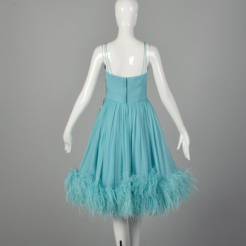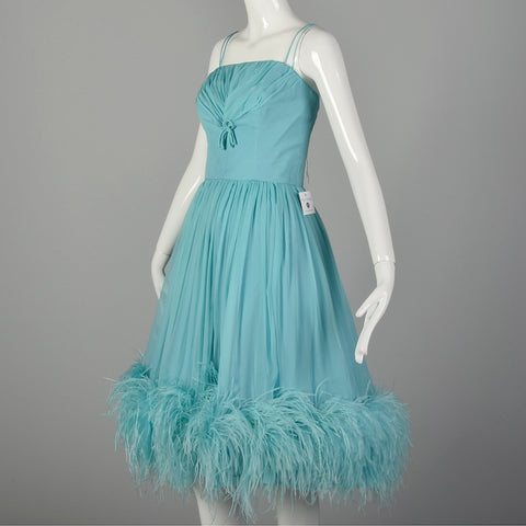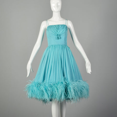 Medium 1950s Aqua Silk Dress Sleeveless Rockabilly Feather Hem