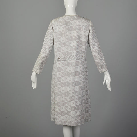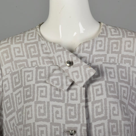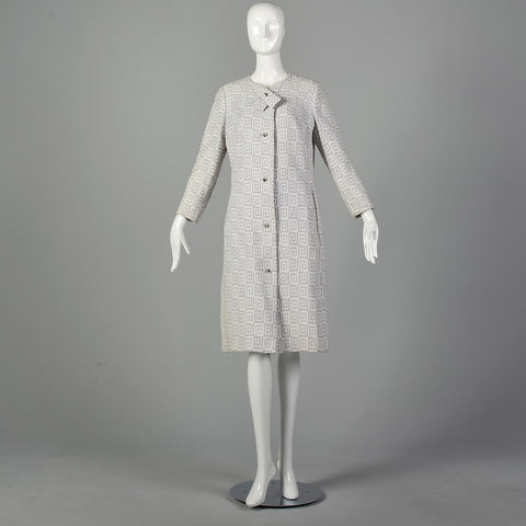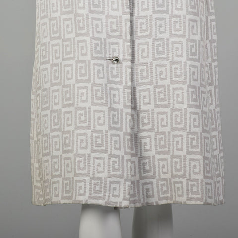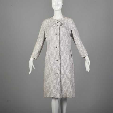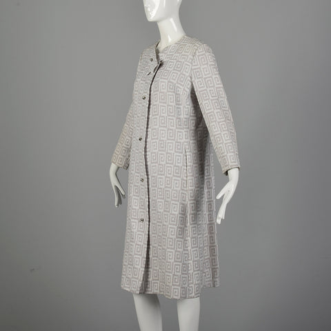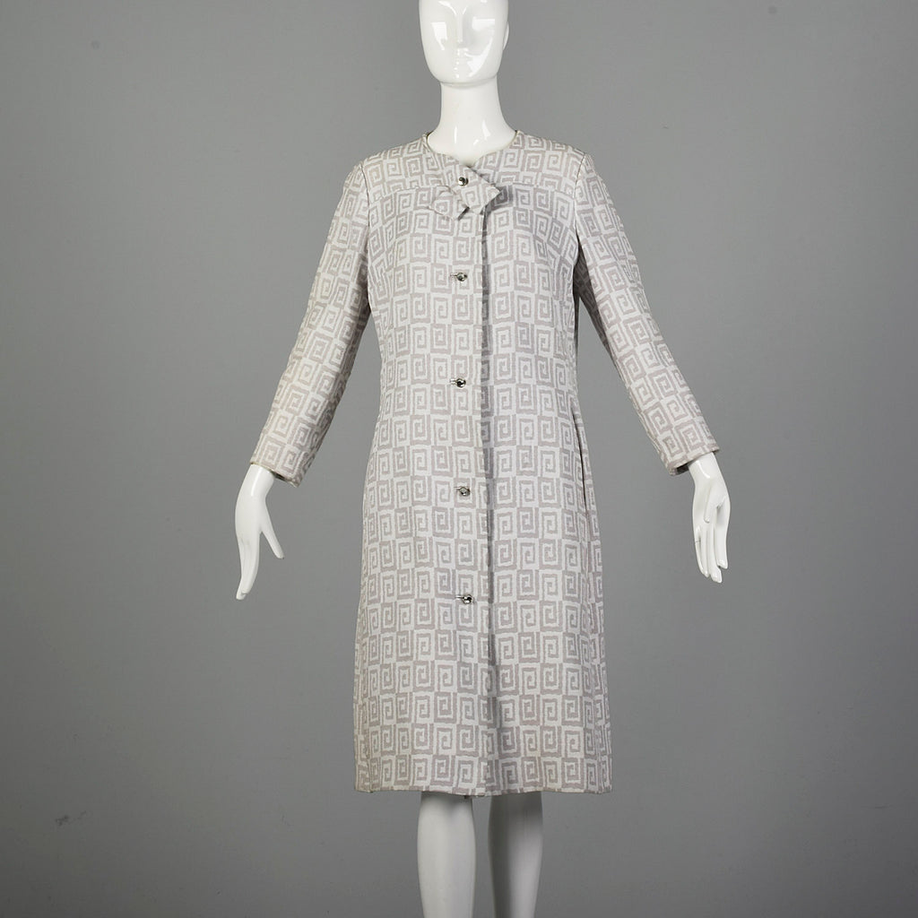 This listing is for one coat. The fabric is unmarked. Lightweight, spring, gray and white dress coat. Greek key pattern with a unique, criss-cross ...