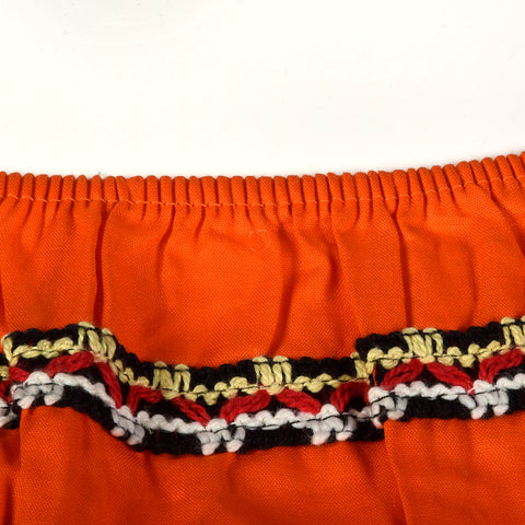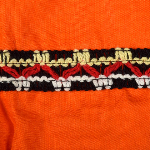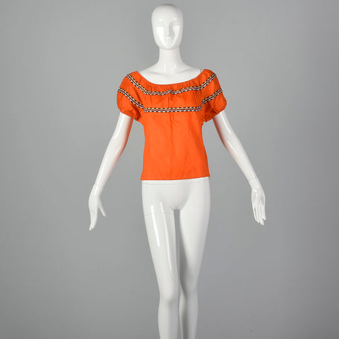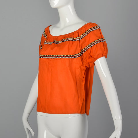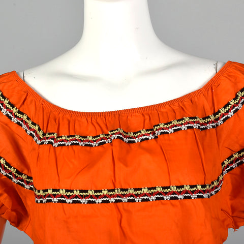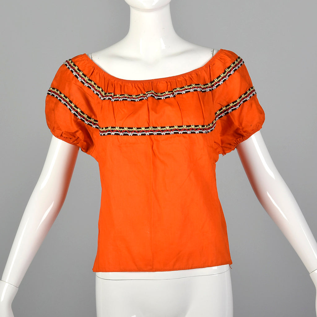 This listing is for one shirt. The textile is unmarked but feels like cotton. Bright orange peasant top. Elastic neck and sleeves allow the blouse ...