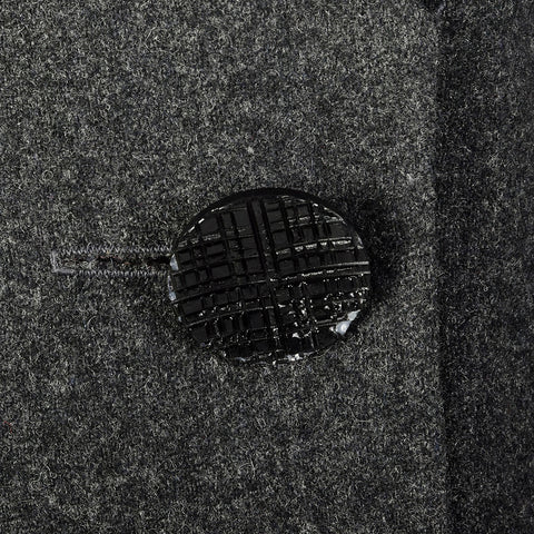 This dark gray dress is made of a soft wool and has button closures. The black buttons have a fun, decorative texture to them. The belted back is a...