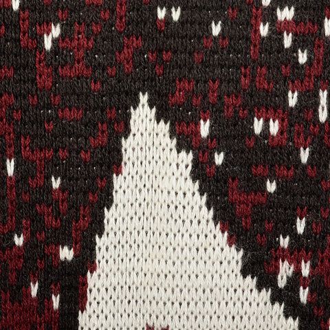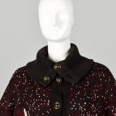 Comfortable oversized novelty knit cardigan sweater with black buttons trimmed with gold and ribbed knit trim. The burgundy, white, and black novel...