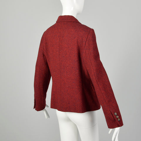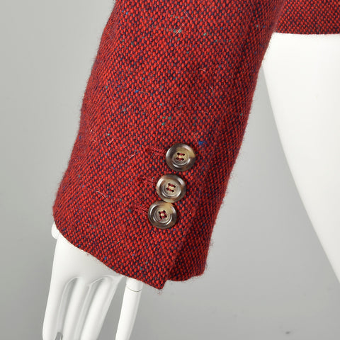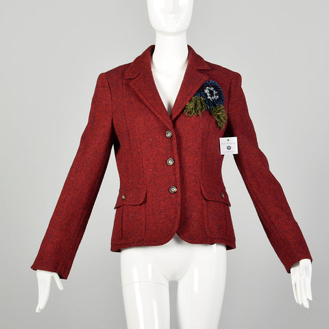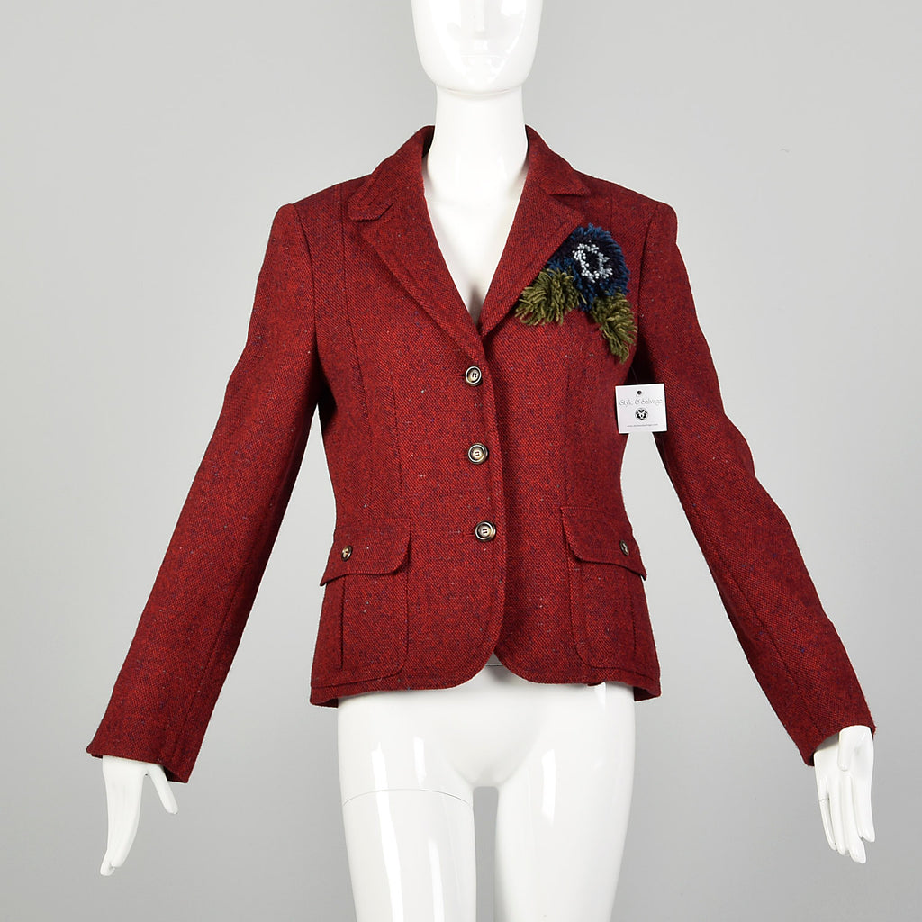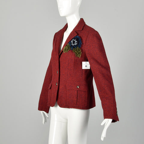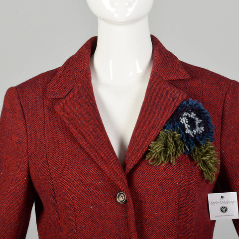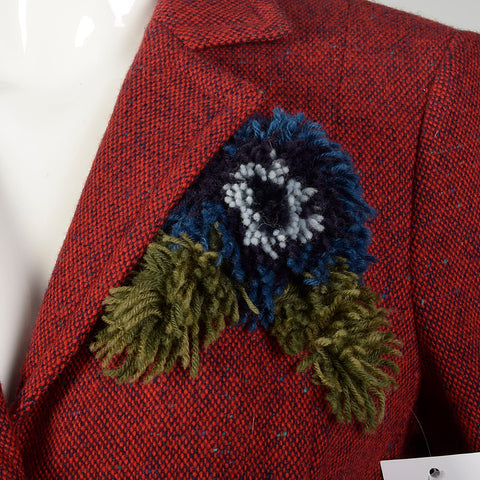 Sassy, red, wool tweed blazer. Blue yarn flower applique on the wearer's left breast. Small pointed collar and flap pockets. Condition Details: Ex...