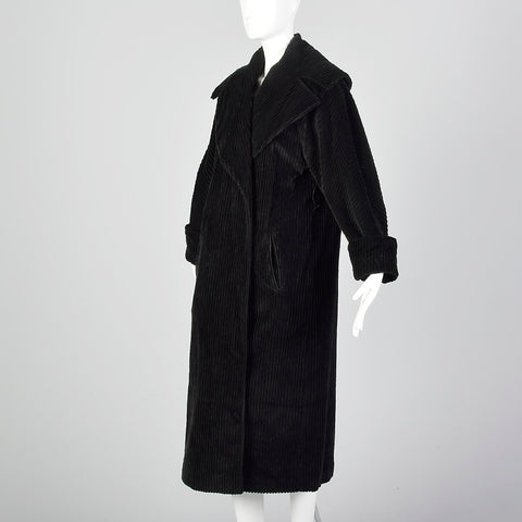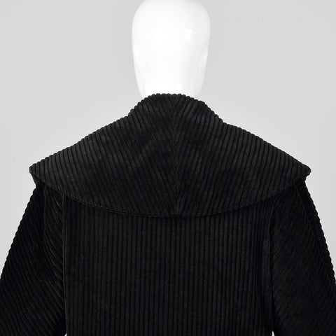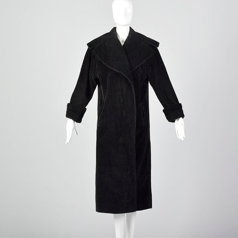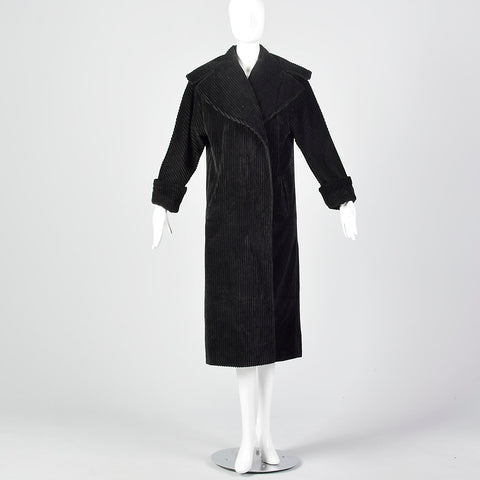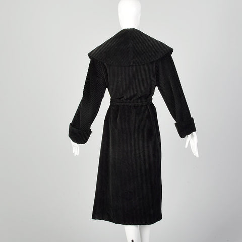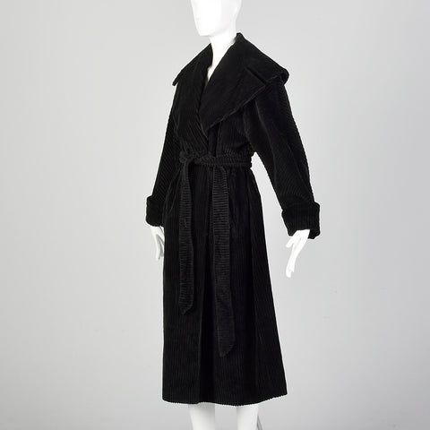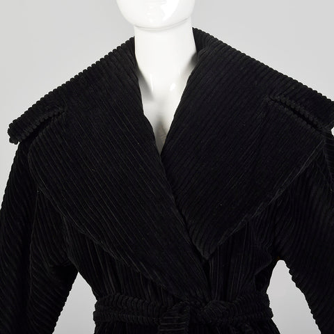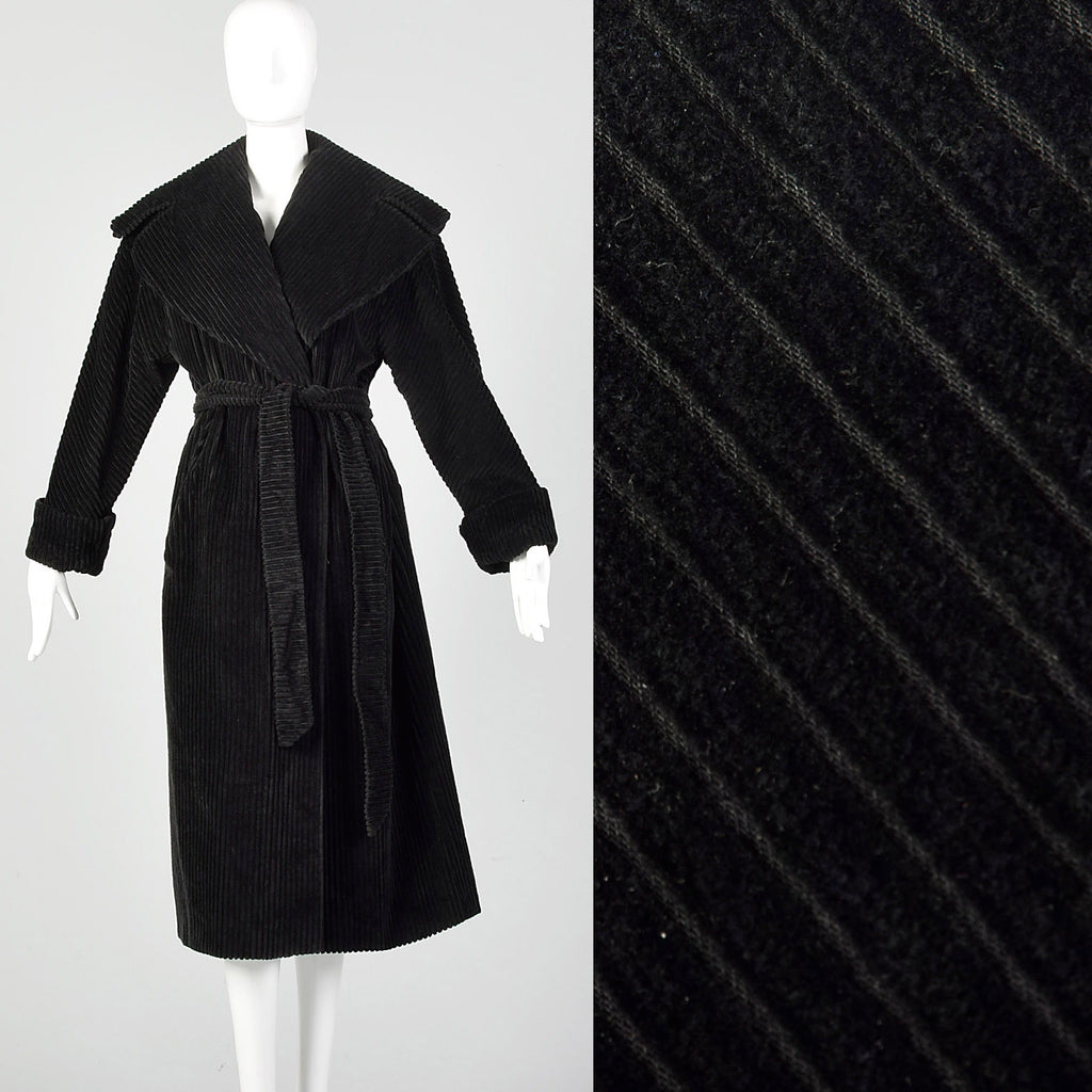 This listing is for one coat. The textile is unmarked. Oversized, black corduroy coat. Large shawl collar and cuffed sleeves. The coat has internal...