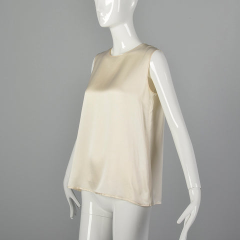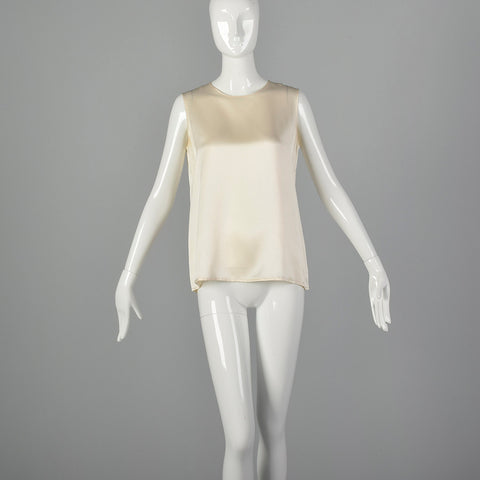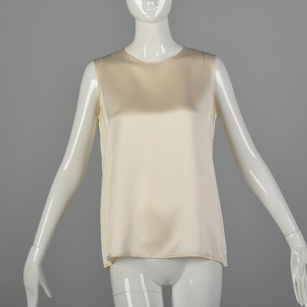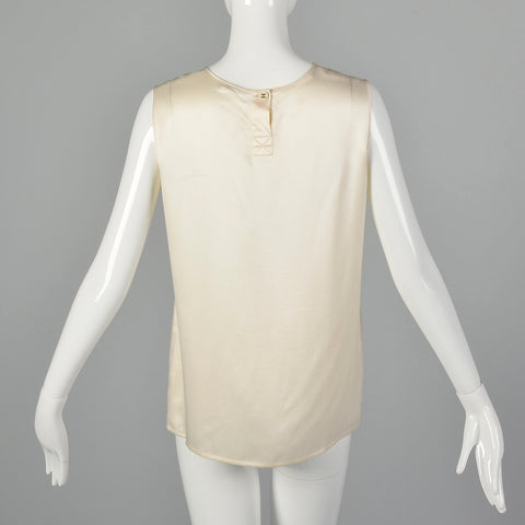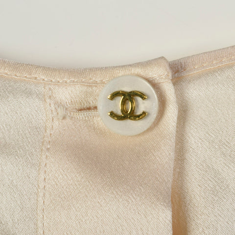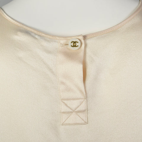 This listing is for one top. The textile is silk. Classic ivory, silk shell blouse. The back fastens with a white button that has the classic Chane...