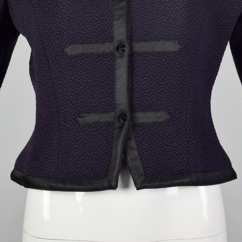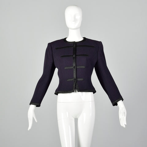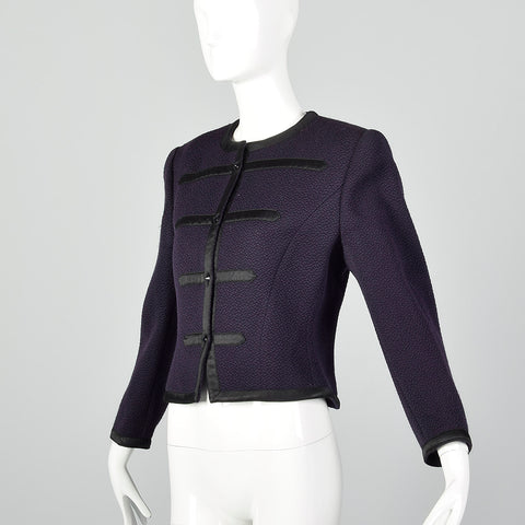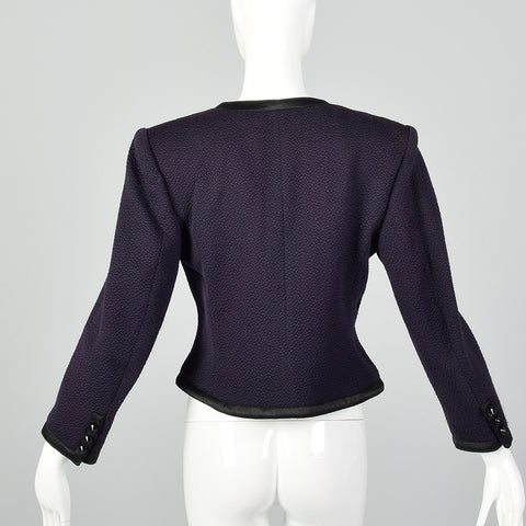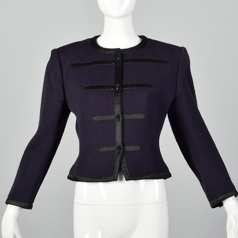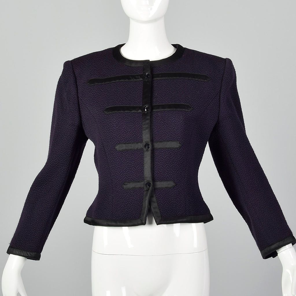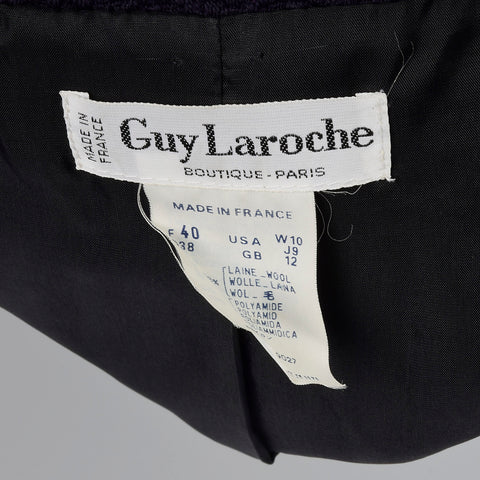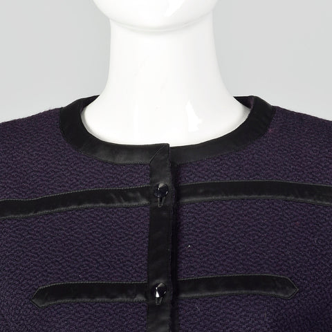This listing is for one coat. Textile is a mid weight wool / polyamide in an eggplant purple hue. Jacket by Guy Laroche features jewel neckline, sh...