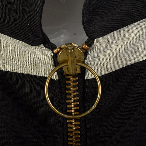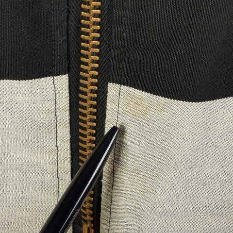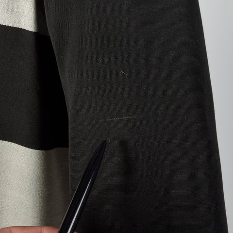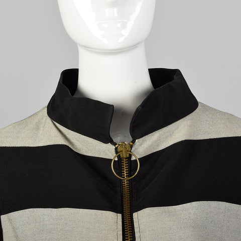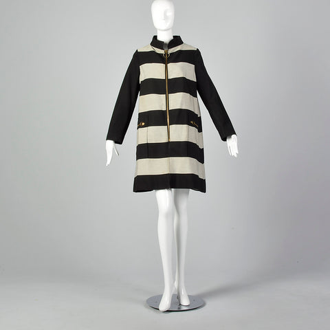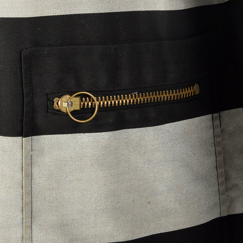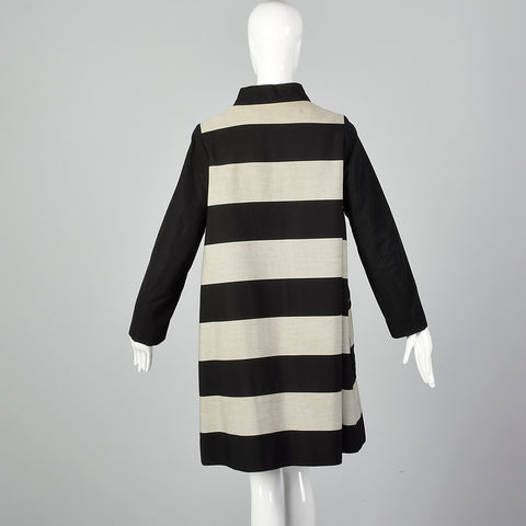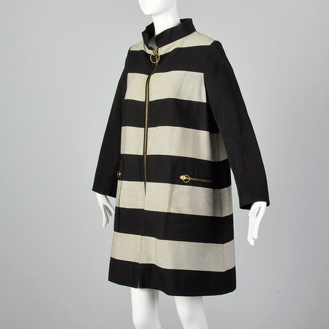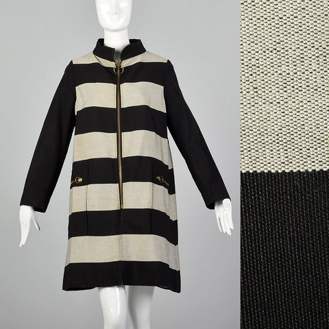 This listing is for one coat. The textile is unmarked but feels like a heavy cotton. Calling in the mod squad! Black and gray wide striped canvas c...