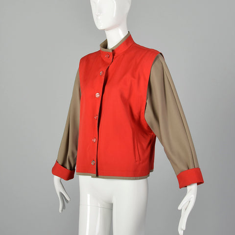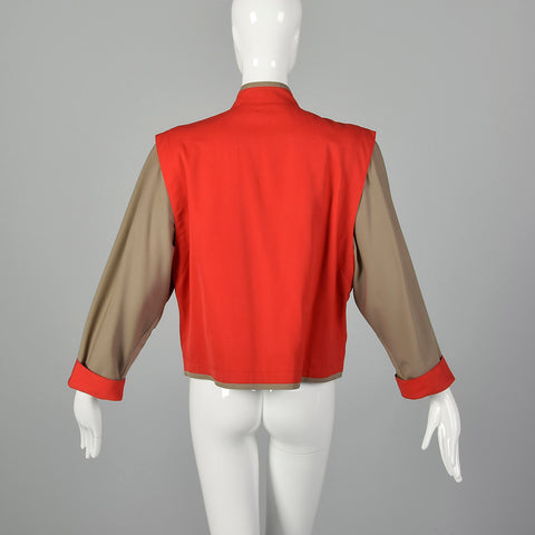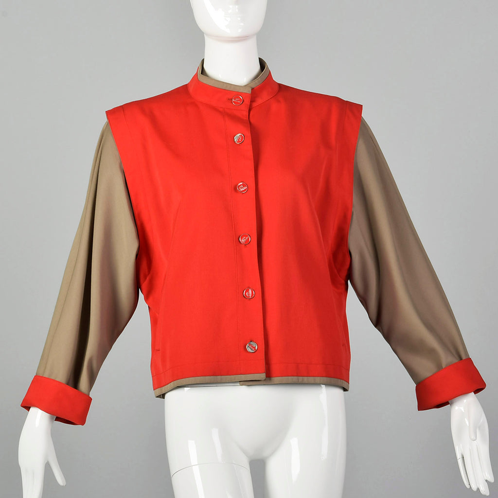 This listing is for one jacket. Textile is a mid weight polyester / wool blend. Jacket by Louis Feraud features red and tan color blocking, large r...