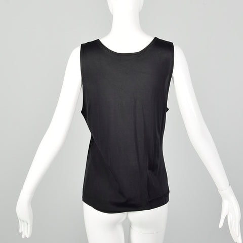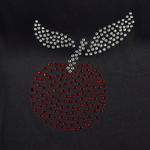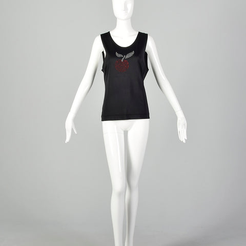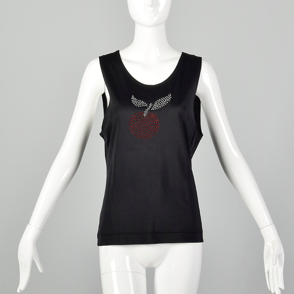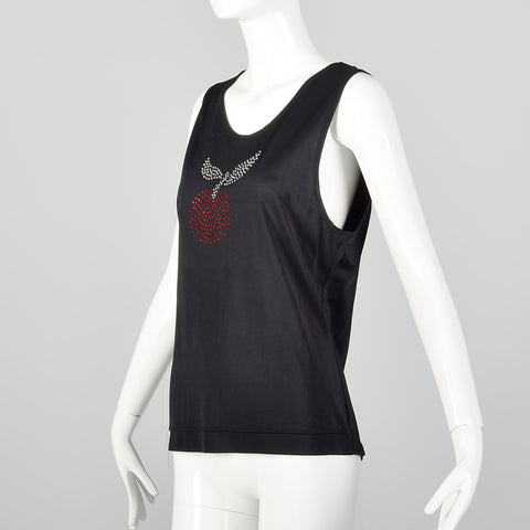 This listing is for one top. The textile is unmarked. Kitschy, novelty black tank top. Silver and red rhinestone cherry on the front. The material ...