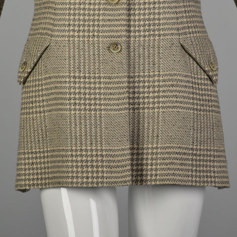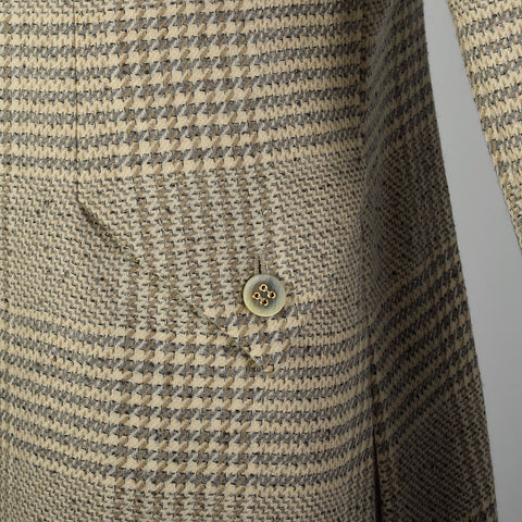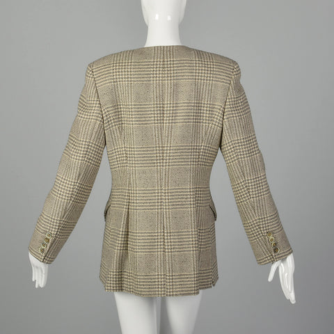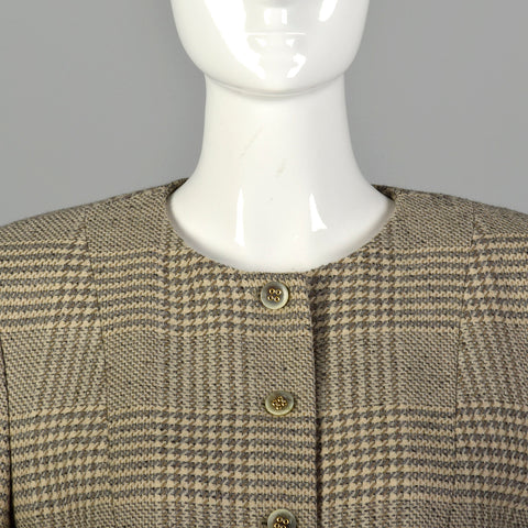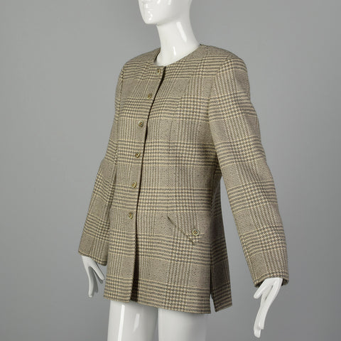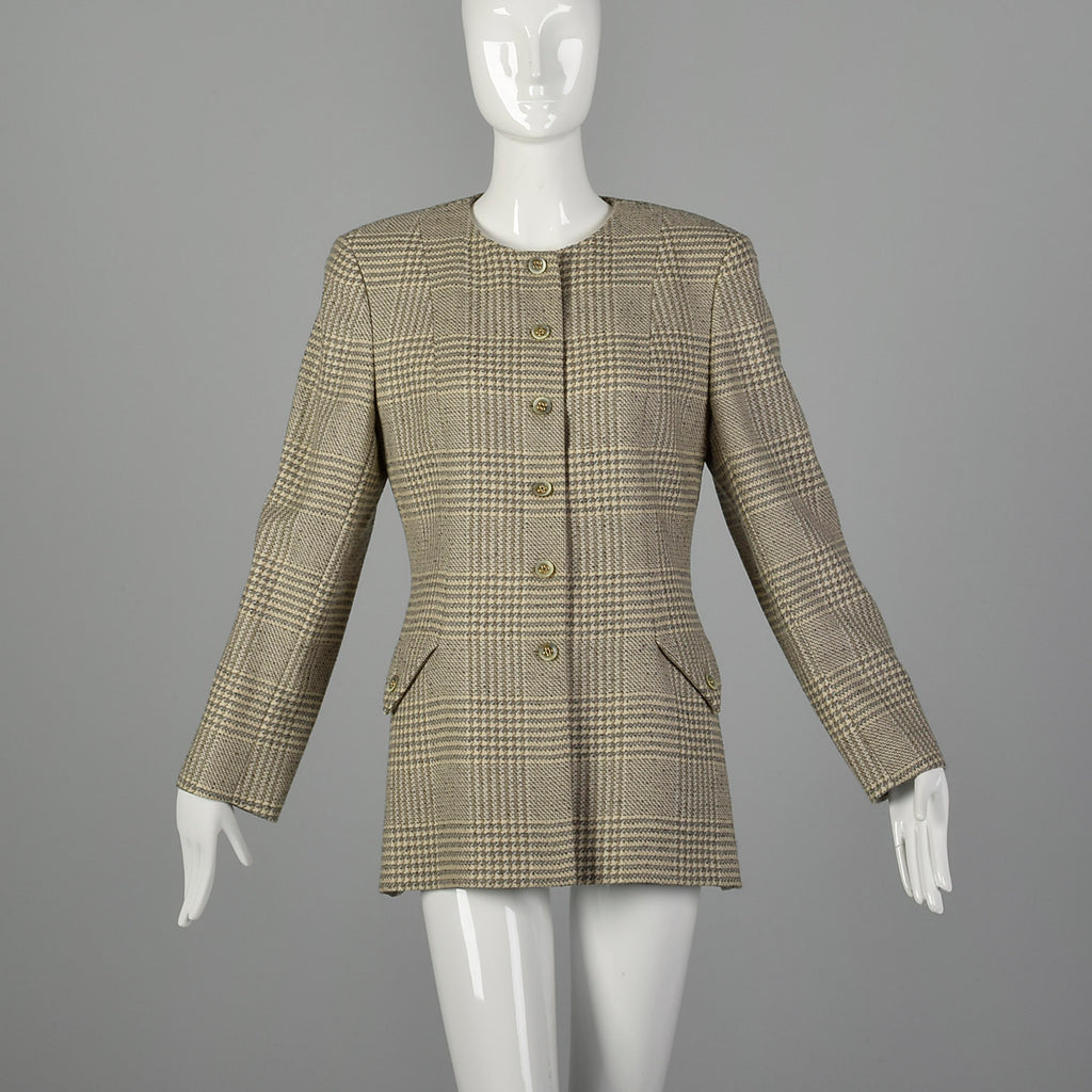 This listing is for one jacket. Textile is a mid to heavy weight wool tweed. Jacket features plaid tweed fabric, jewel neckline, shoulder pads, lon...