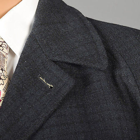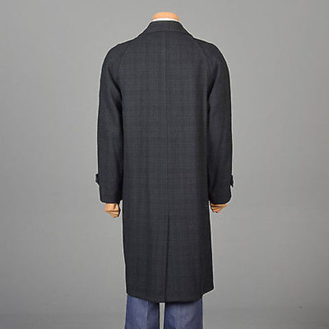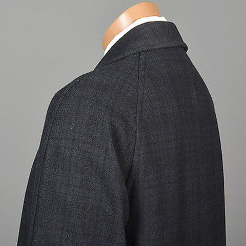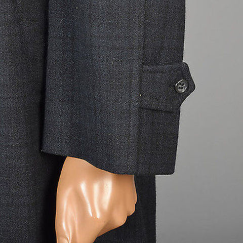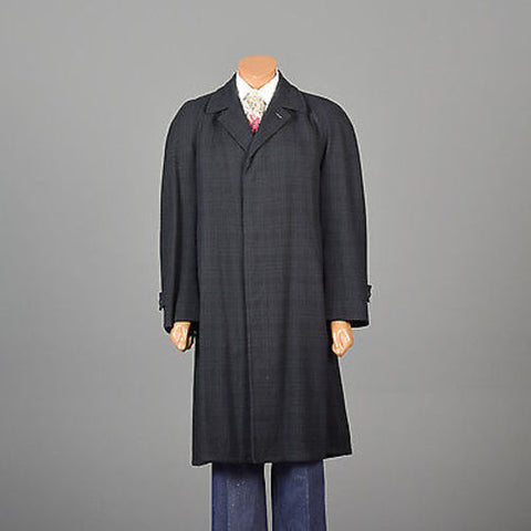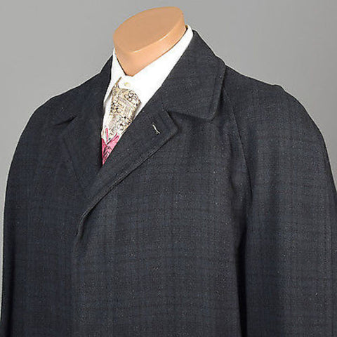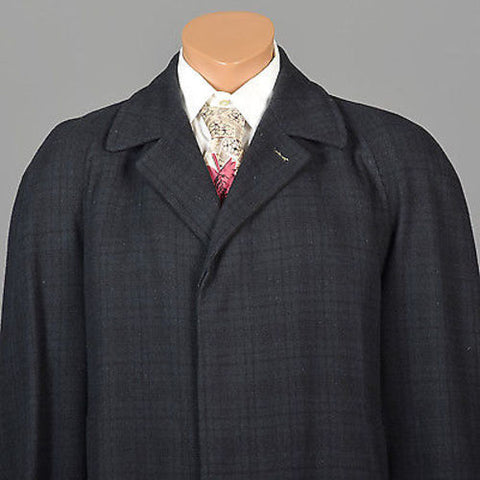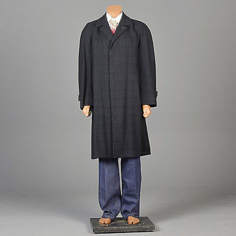 Mens 1950s Black Navy Blue Tartan Coat Overcoat Medium Weight Wool Plaid