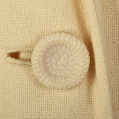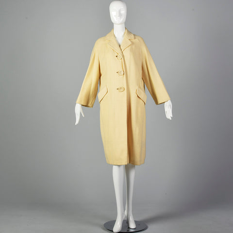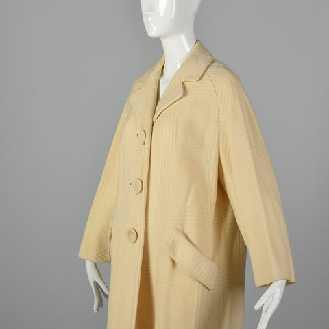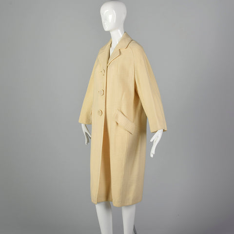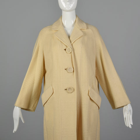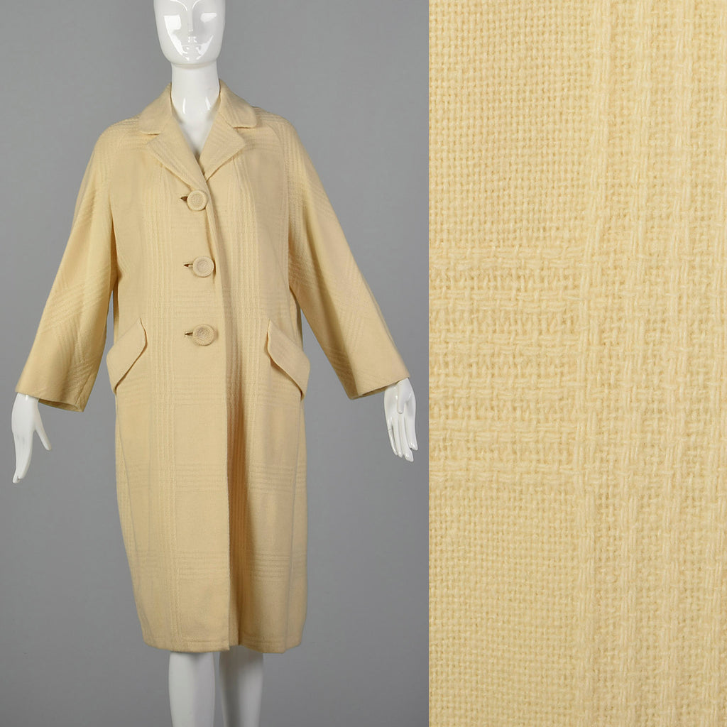 This listing is for one coat. Textile is an unmarked fall to winter weight wool or wool blend in cream. Coat features notched collar, raglan style ...