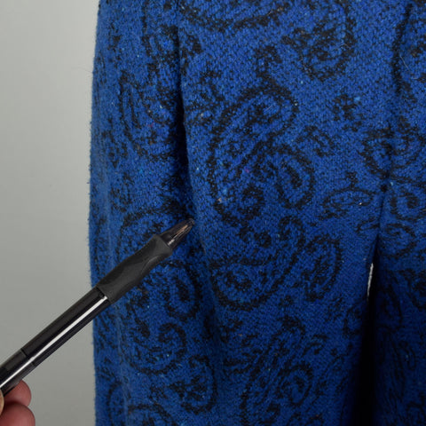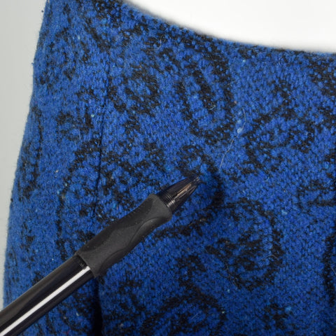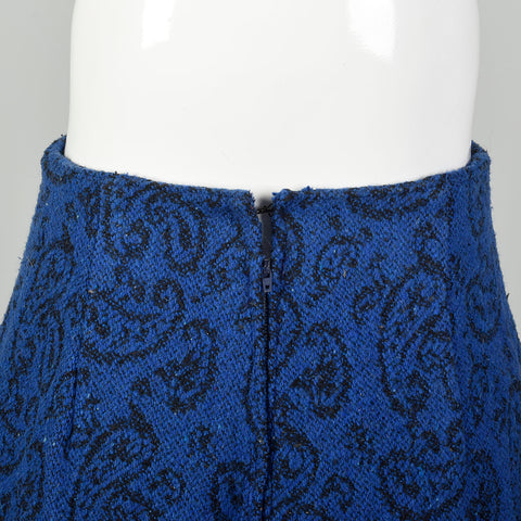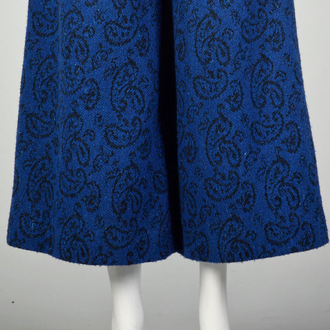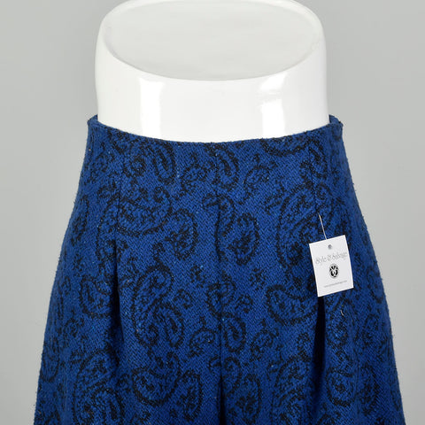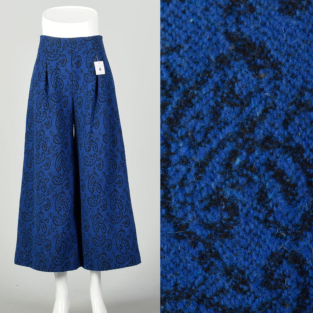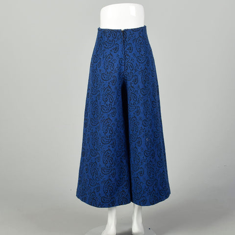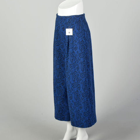Small 1970s Blue Gaucho Pants Black Paisley Pleated Cropped Wide Leg